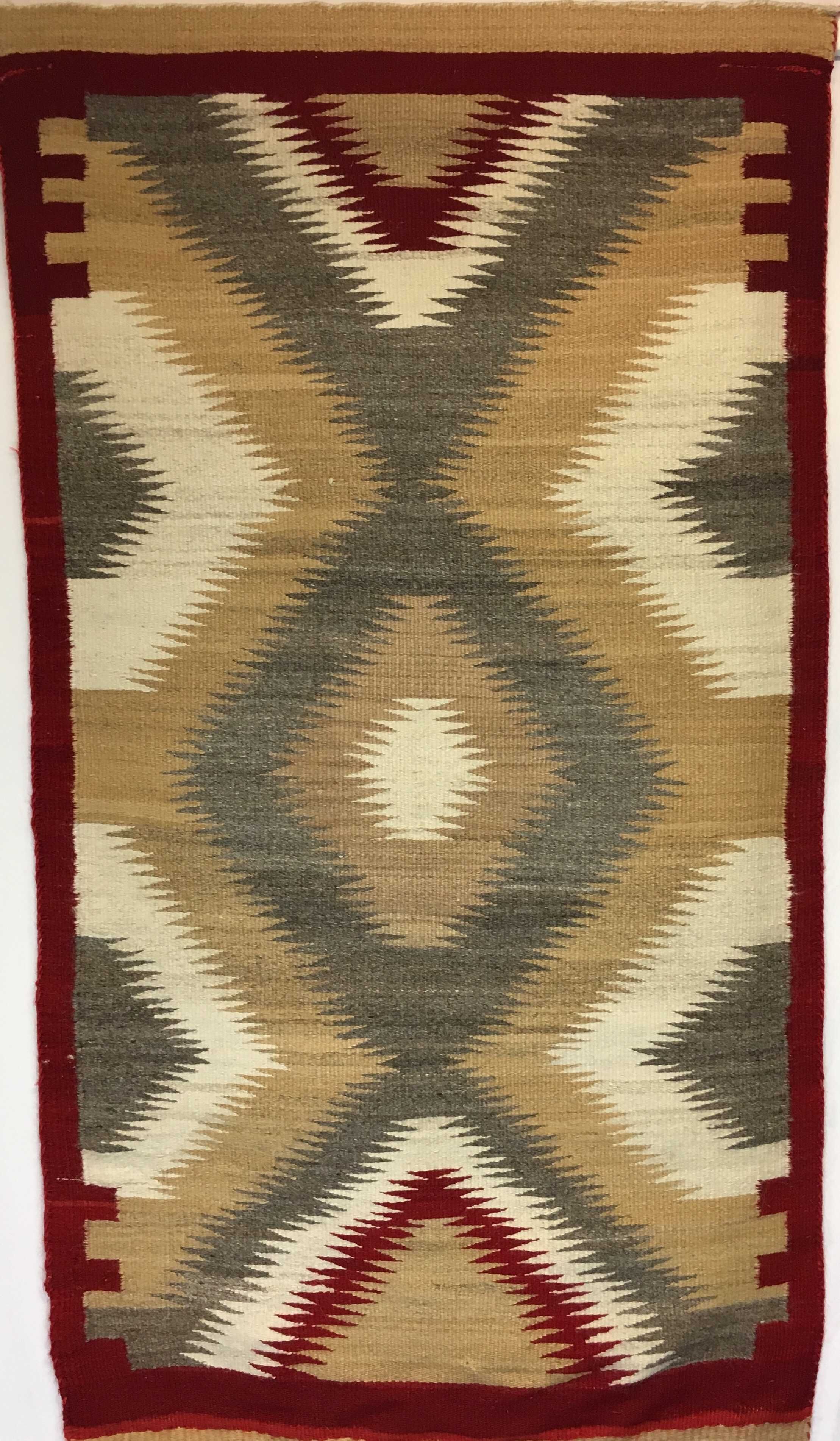 A somewhat unusual eyedazzler, with plain brown stripes at the top and bottom and a red border with four small interior rectangles on one end and three on the other. The central design is a diamond with halves, with the center white, followed by tan, then grey. The top and bottom half triangles have tan at the center followed by red then white then grey.Navajo Rug Textile Details