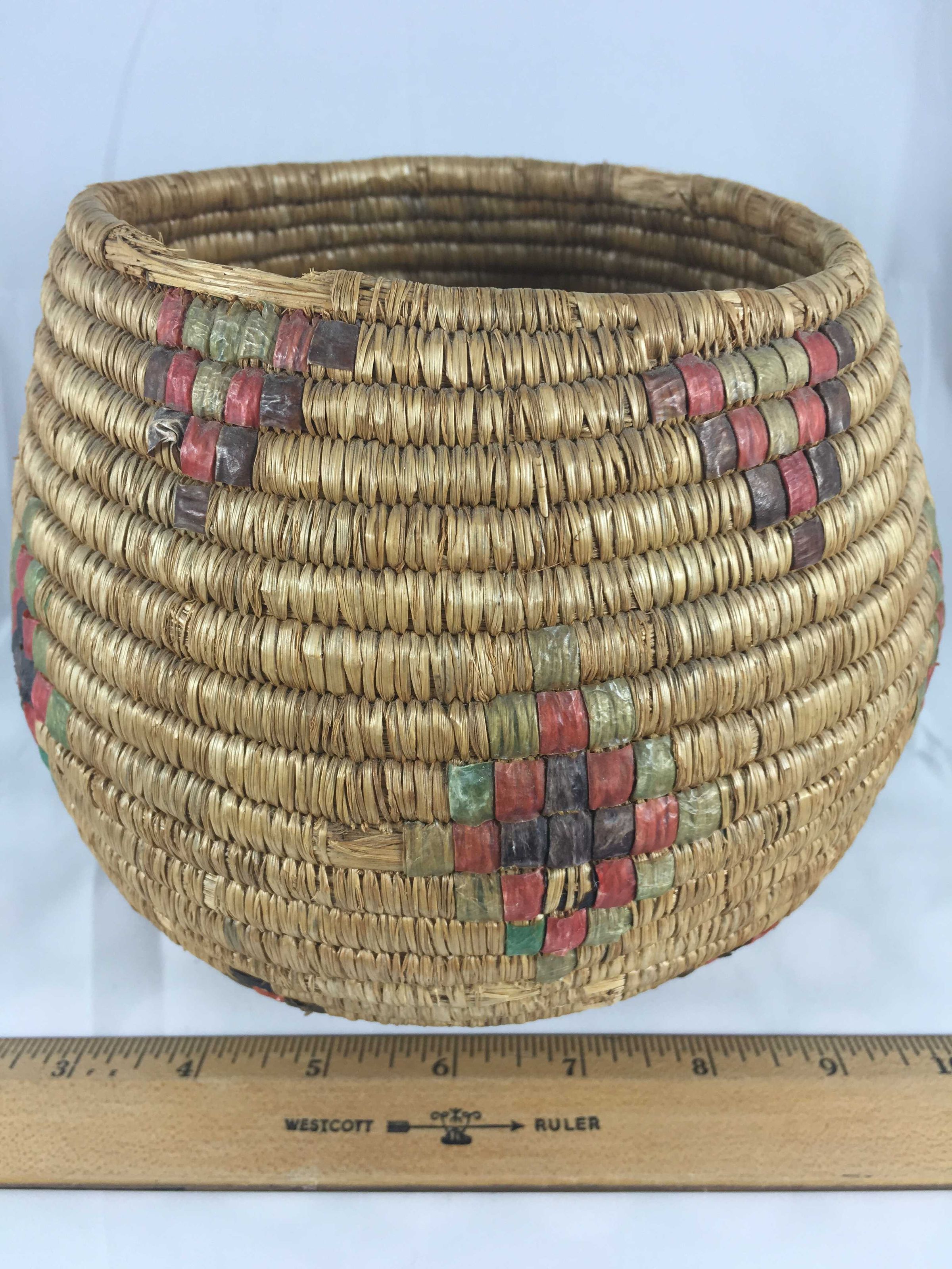 Interesting old basket beautifully decorated with triangle designs made up of green, red and purple dyed seal gut.