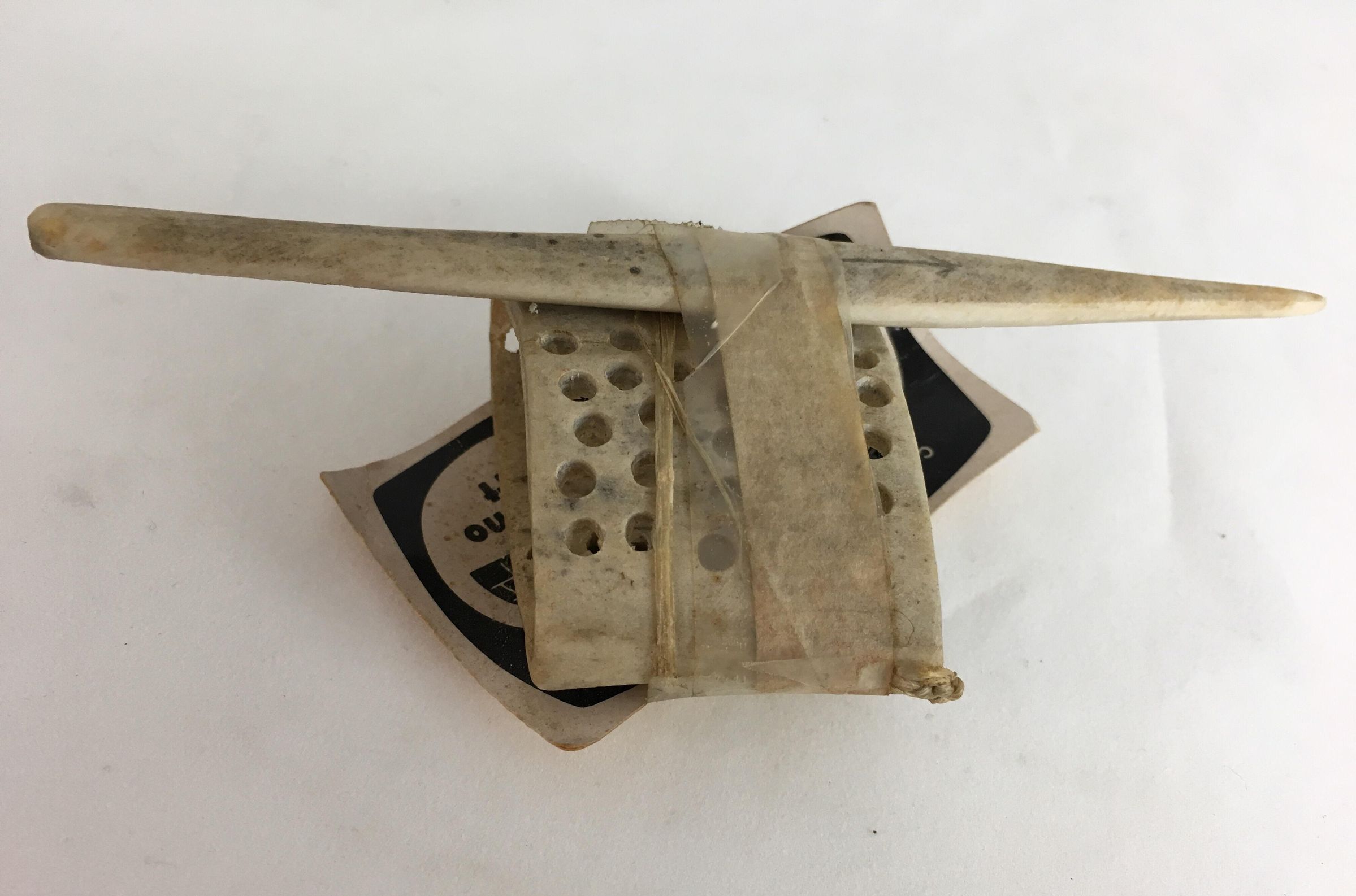 Traditional Inuit game consisting of a sharpened bone attached to a segment of hollowed antler that has been perforated with numerous small holes. The game is played by tossing the antler segment and trying to catch it with the pointed bone. This piece is taped up, likely from the time it was originally sold. There is an arrow drawn in pencil, about 5/8" long, on one side of the sharpened bone, pointing towards the point.Made/Created