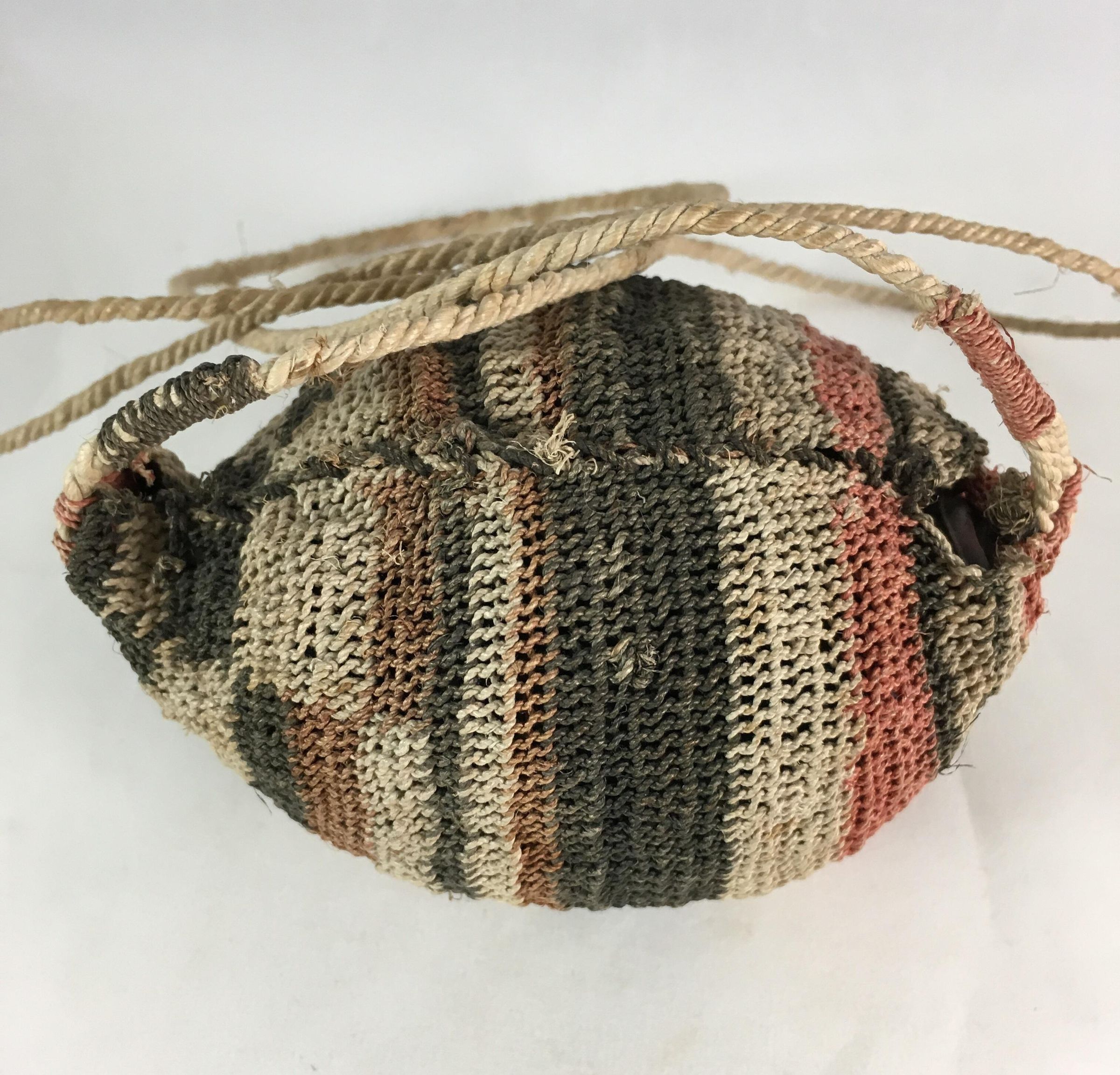 Small globular knotted/macramé bag made of natural and dyed caraguatá fibers made for transporting seeds. The bag, which has been sewn closed, is filled with large round seeds. There is a long handle made of spun caraguatá fibers, one end of which is tied together with fine dark brown fiber and the other end of which is tied together with fine red fiber; both ends are attached to the bag with fine red fiber. One end of the bag is decorated with bands of red, dark brown (or black), light brown (or rust), and natural fiber, while the other end has several bands that consist of rectangles of brown/black and rust color alternating with areas of natural fiber.Use