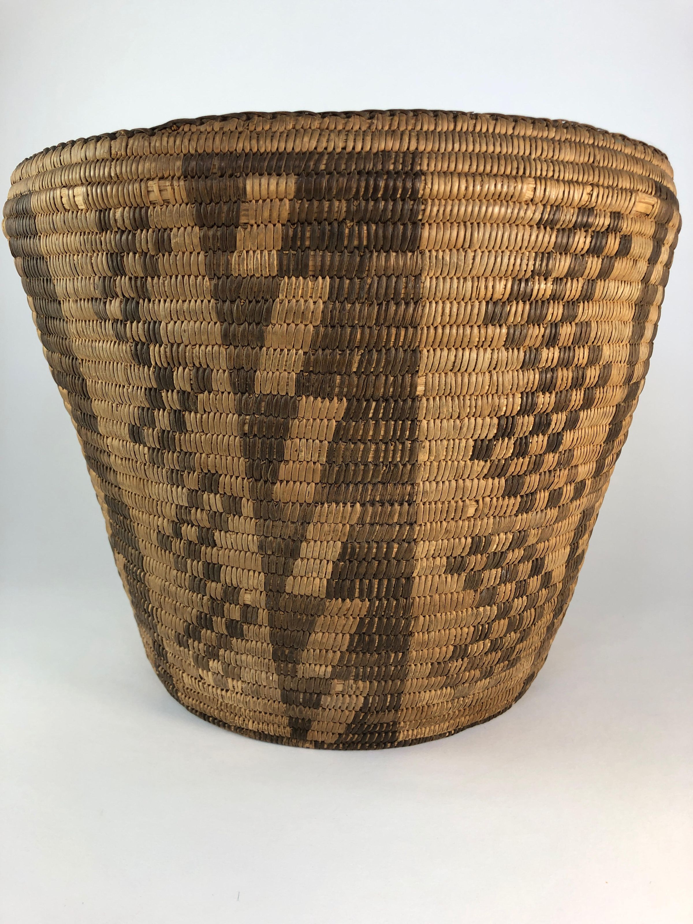 An unusual tall flaring old Pima basket with alternating vertical patterns of undulating checkers and dark bands with light parallelograms.