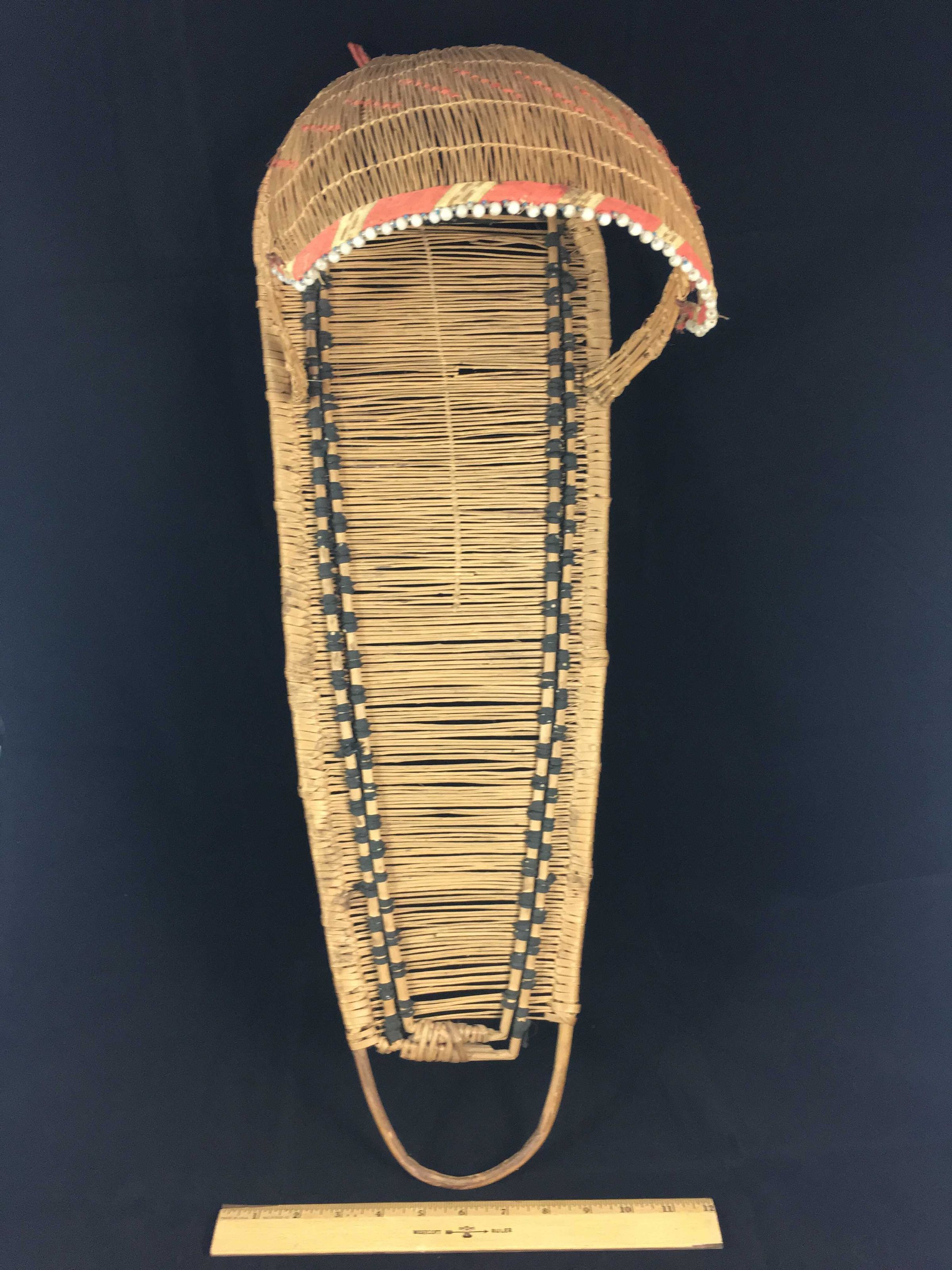 Diagonal lines in red cotton cloth across the middle of the hood. The face side of the hood has a strip of pink, white, light green and gold/mustard colored cloth sewn on . The reinforcing rods along the front of the cradle are tied in place with black cotton cloth that has small white polkadots on itDecoration Material