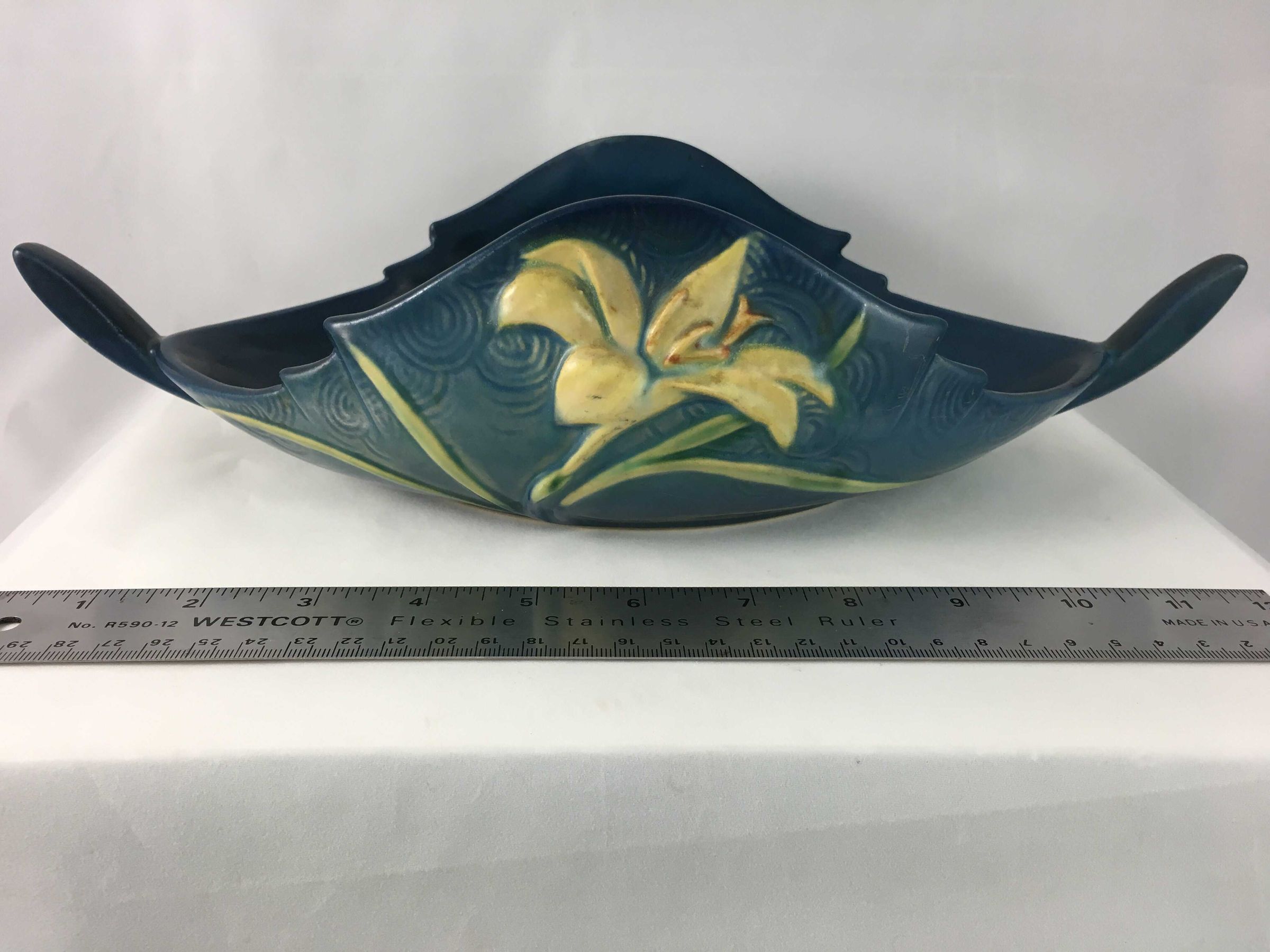 Roseville blue zephyr lily console bowl with yellow lilies on both sides.