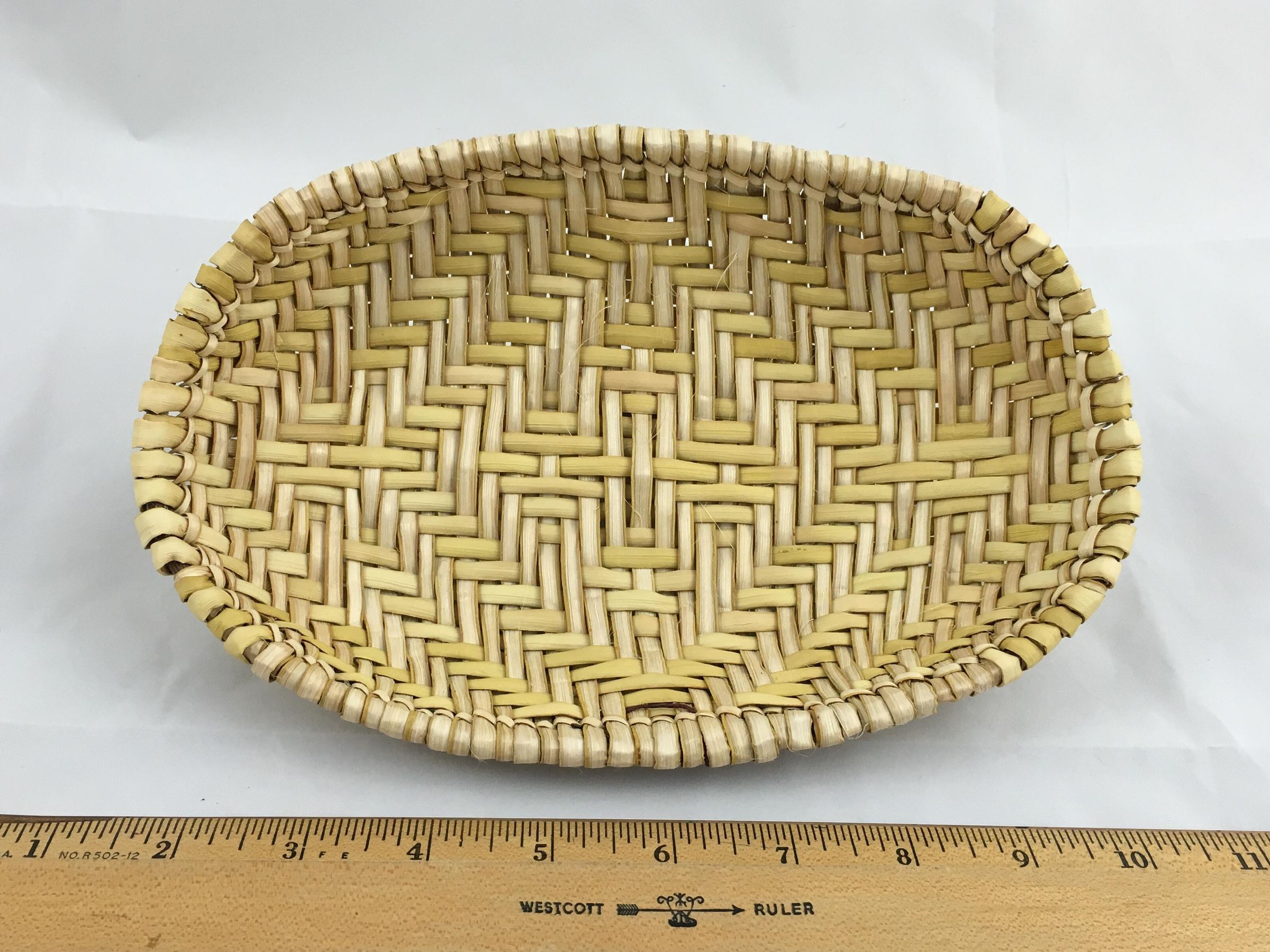 Classic oval-shaped Hopi sifter ring basket made with white and yellow yucca, in perfect condition. The design was made using differing plaiting spacing with the two colors of yucca.Ethnography