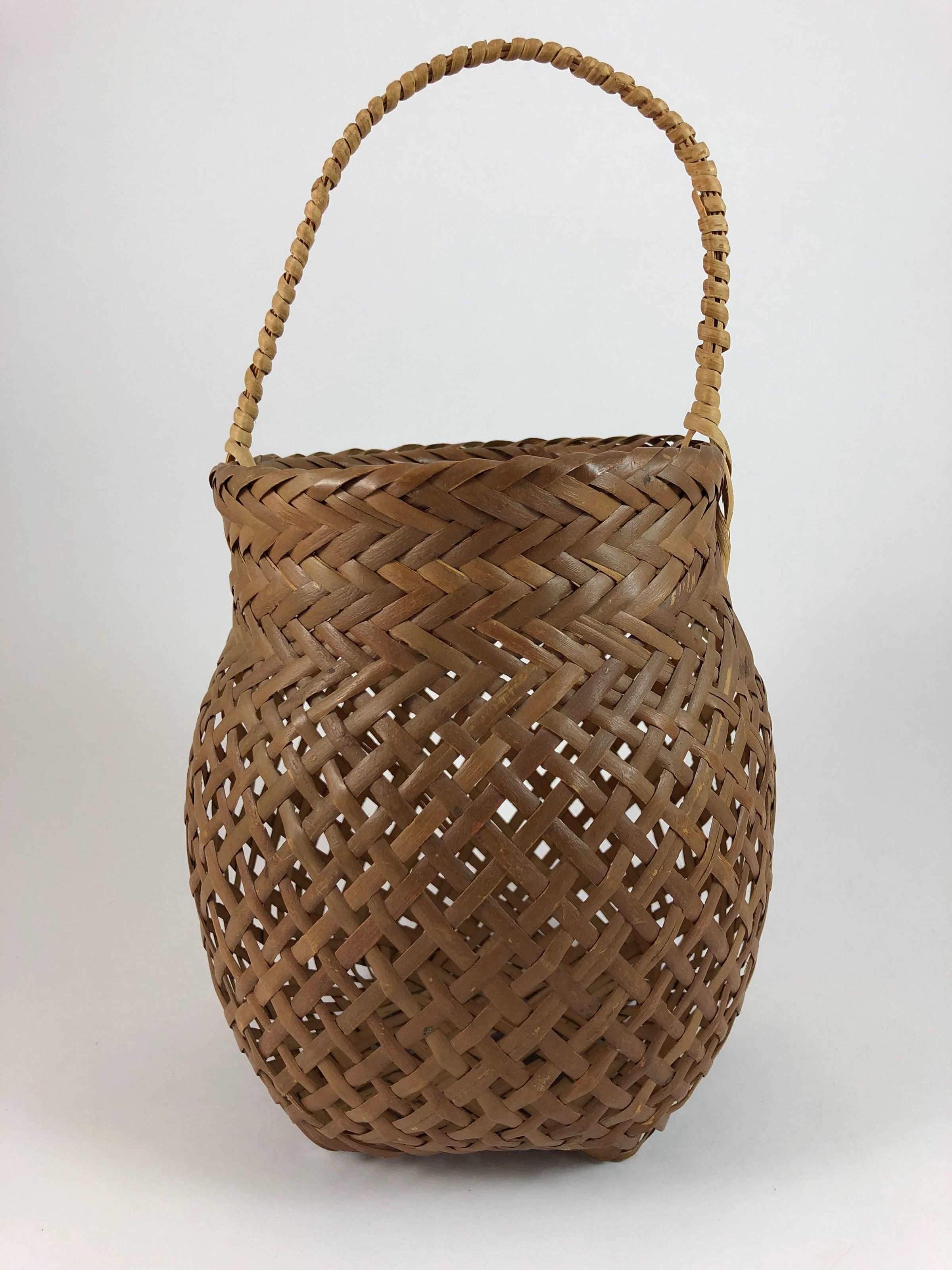 The handle manufacture and attachment is interesting- a couple of pieces of cane bent and run through the upper portion of the basket, then wrapped in cane with the tail of the wrapping ending by weaving down into the plaits of the basket.