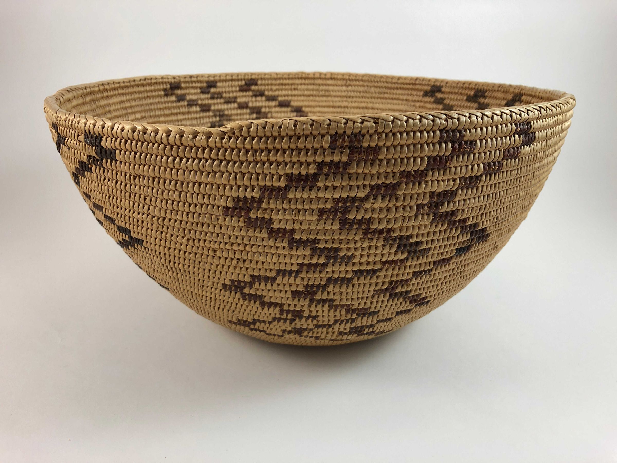 Nice basket with a design consisting of four sets of three vertical zig-zag bands- two sets of black bracken fern and two sets of redbud.