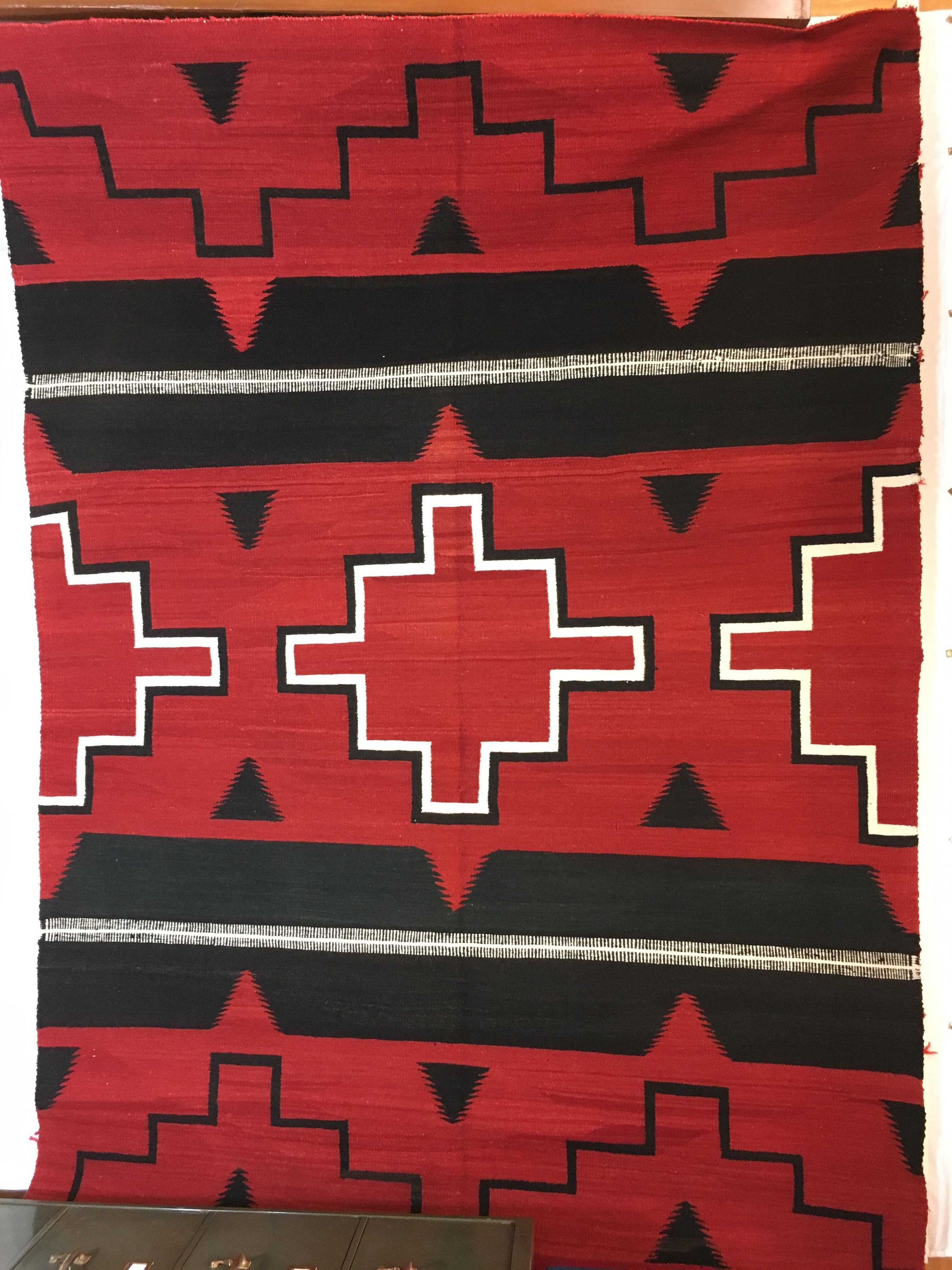 This is a large and heavy rug woven in the style of a third phase chief's blanket. There are roughly three design bands, each of which seems to continue off the sides. The central band consists of a stepped cross outlined in white then in black. On either side of this band is a band that is essentially a large black "W" from the top and a "M" from the bottom, with a white stripe horizontally through the center. Following these are a single black line forming steps up and down, parallel to the crosses in the center row. Between the design elements are small black serrated triangles. The background is deep red. Use