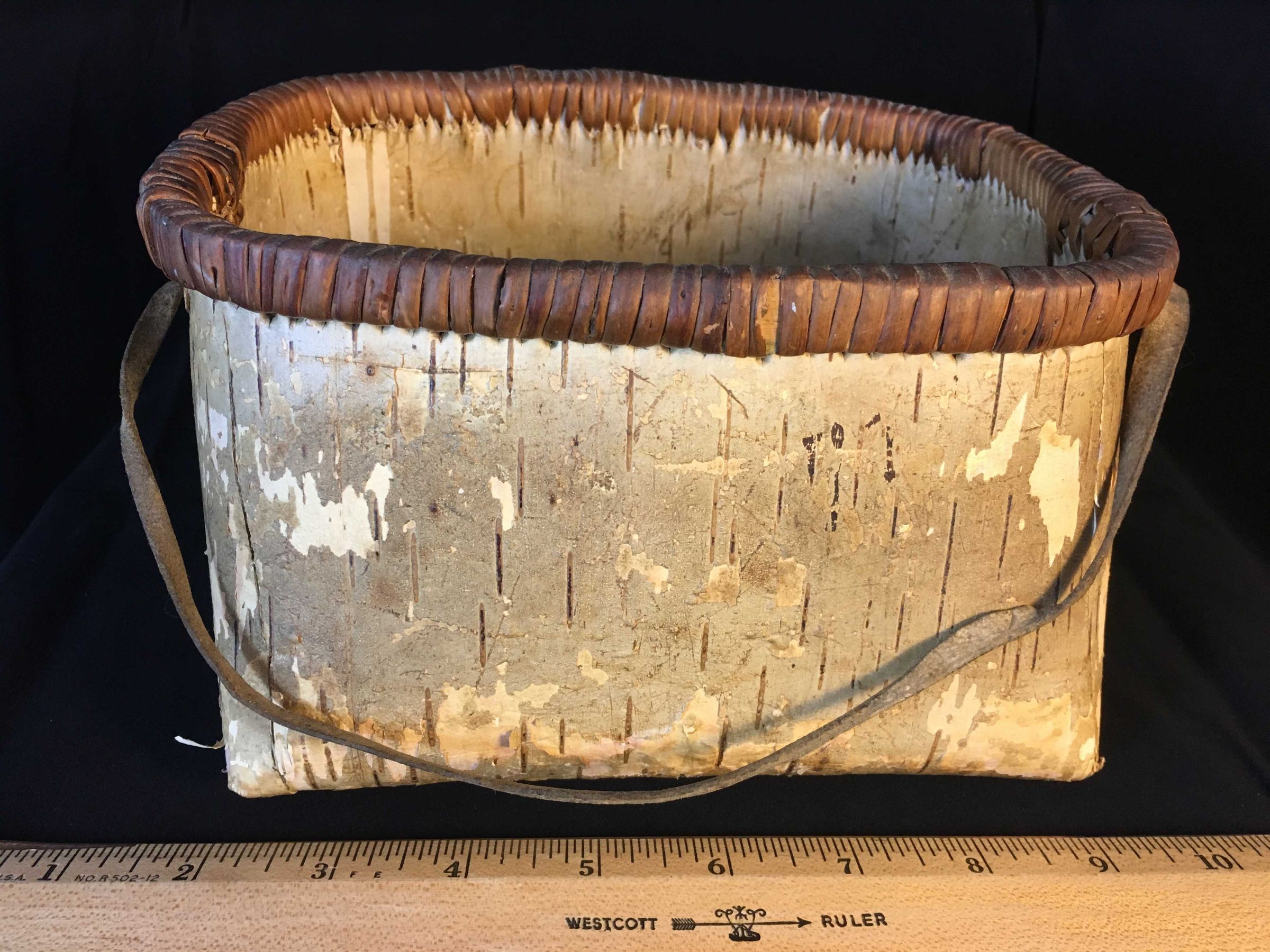 Superbly made old rectangular birch bark berry gathering basket. It's leather handle shows much evidence of use.Ethnography