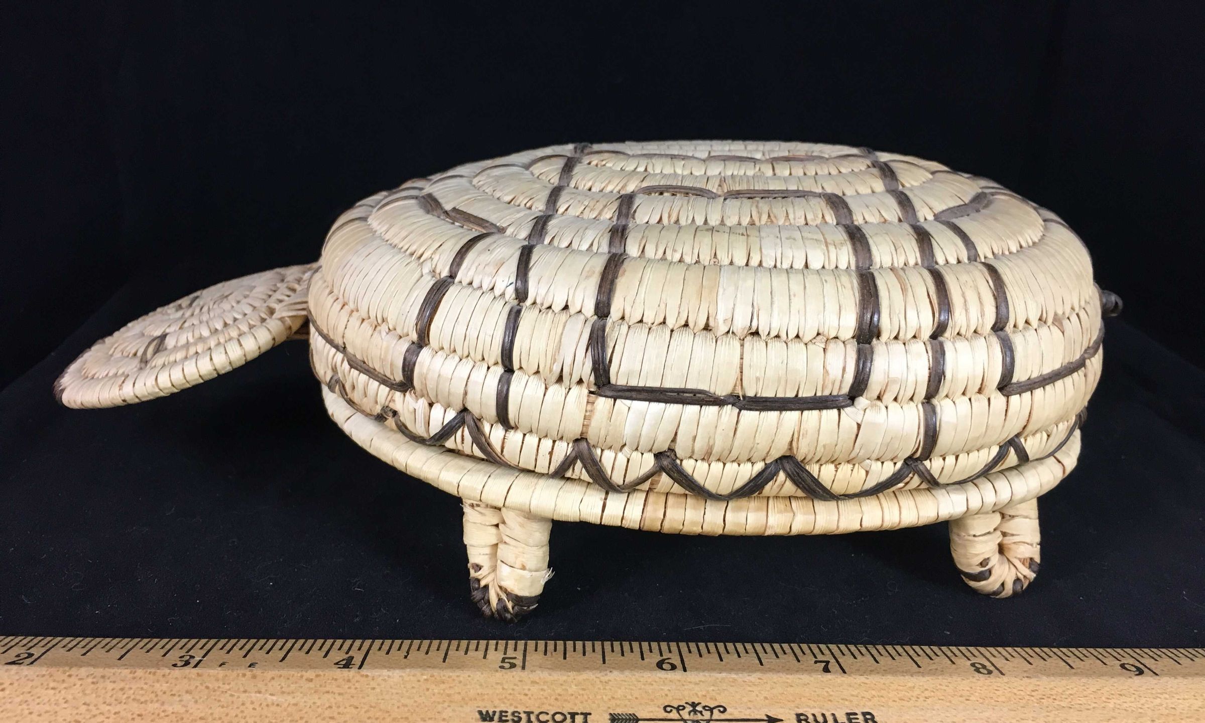 Nicely made turtle shaped basket with the devil's claw design elements mostly sewn on.