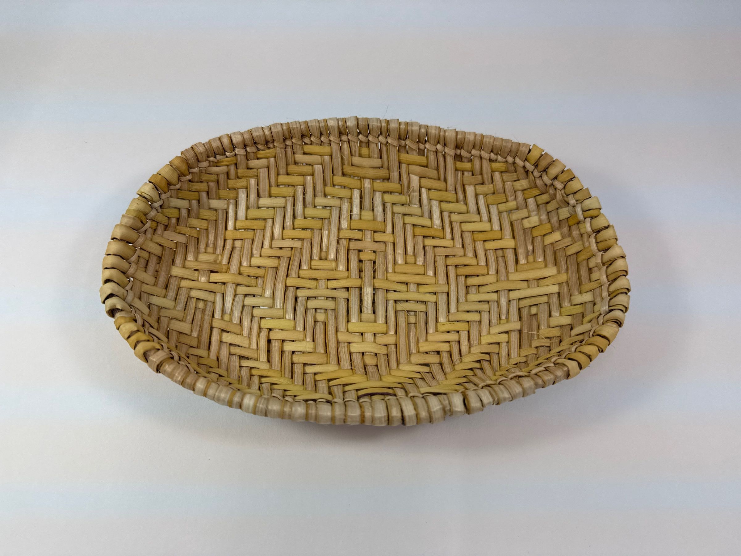 Classic oval-shaped Hopi sifter ring basket made with white and yellow yucca, in perfect condition. The design was made using differing plaiting spacing with the two colors of yucca.Ethnography