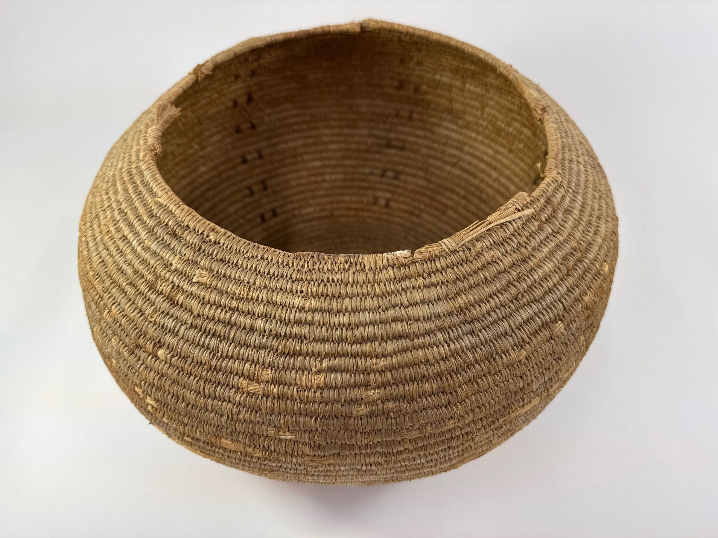 Old, well used basket from the Arctic. The simple designs, consisting of six sets of parallel lines of two brown dots rising up the sides of the basket are faded but still visible from the exterior but can be readily seen on the interior.