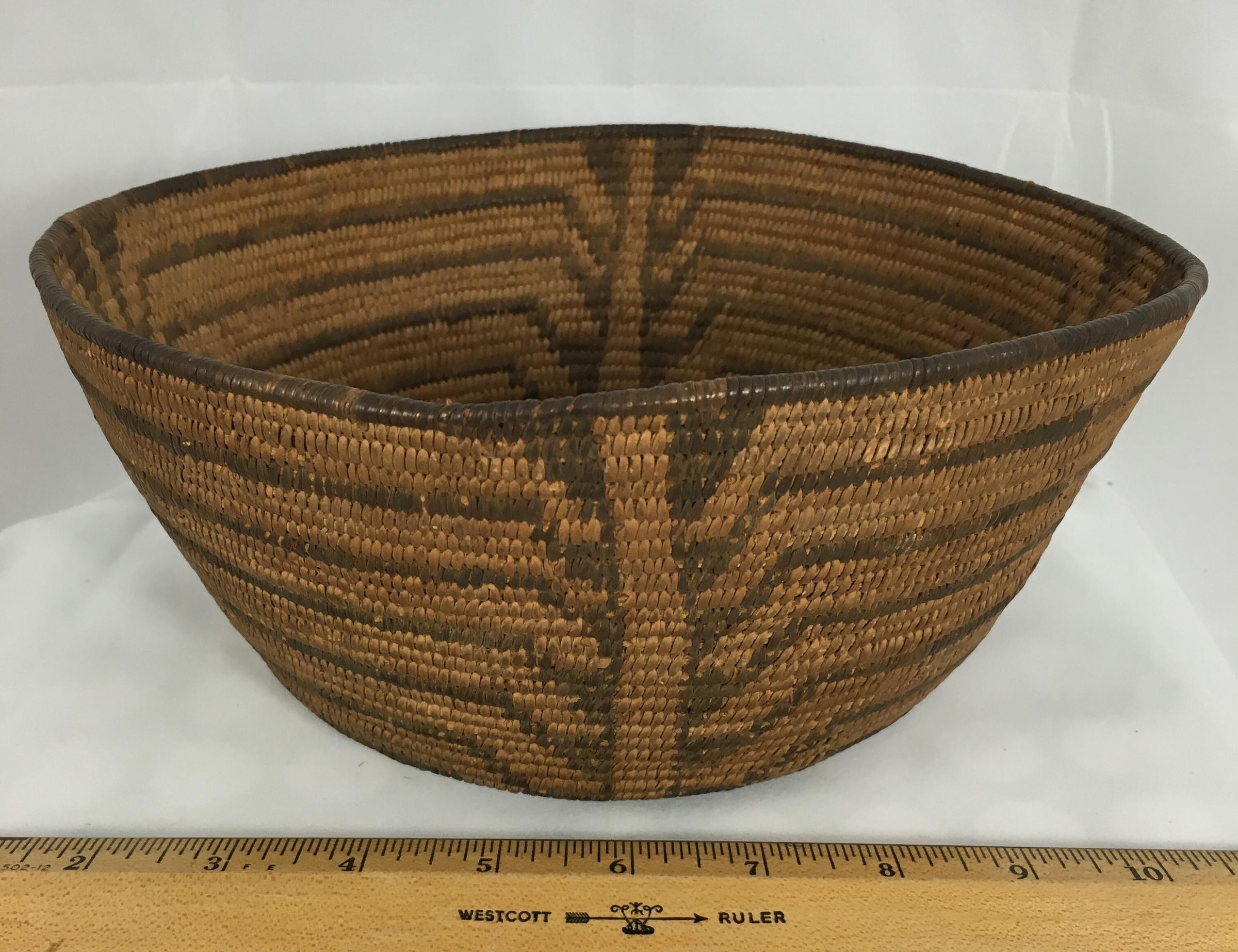 Pima wine bowl, extremely well made and in near-perfect condition. The self-coiled devil's claw rim is particularly good.