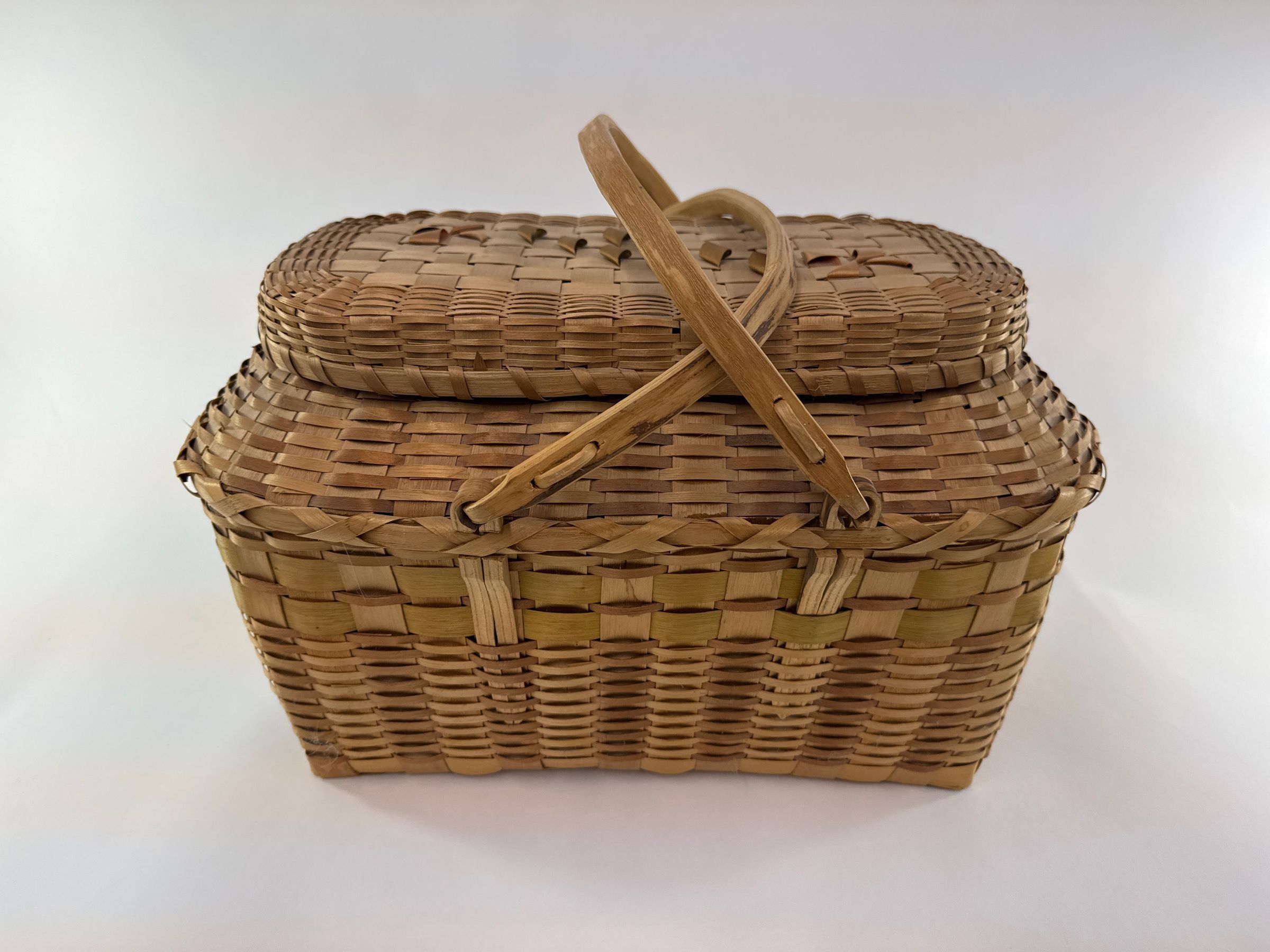 Large, sturdy picnic basket made by weaver Margaret Decorah of Wisconsin Dells in 1972 at the age of 84. It is in excellent condition, other than fading of the dyed splints on the exterior and a couple of small, probably water, stains on the lid. Superbly made carved, bent handles.Made/Created