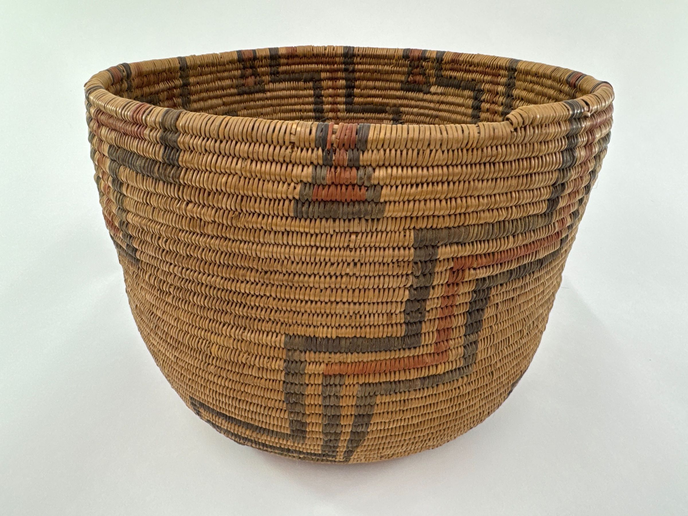 Large, sturdy Yavapai basket, probably made for tourist sale. Perfect condition. Beautiful bold design, that continues through the base to the start. Per seller, circa 1900.