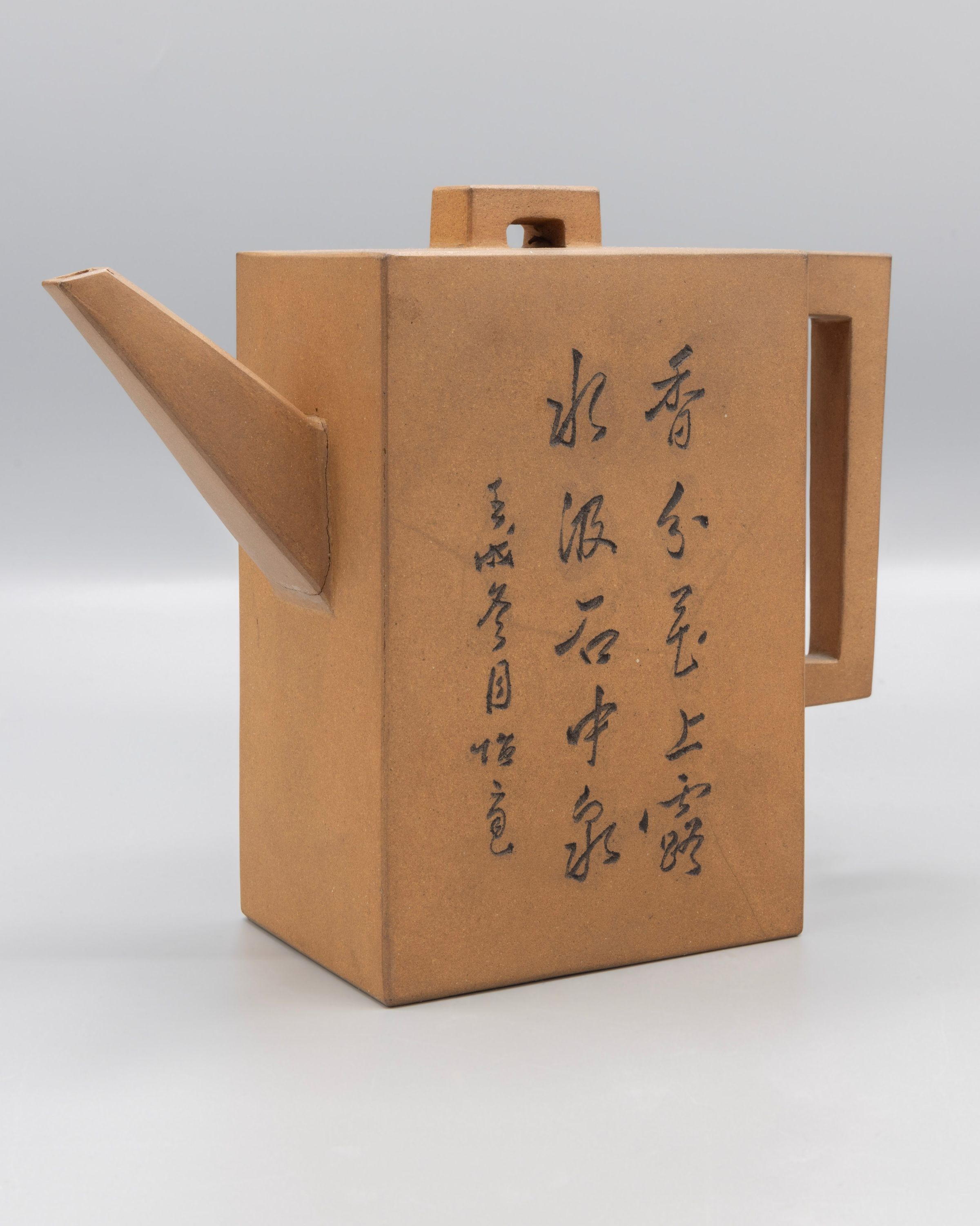 This teapot is made from unglazed reddish-brown clay, molded in a rectangular form. The exterior of the teapot is decorated with incised floral decoration consisting of two groups of flowers connected by a curving branch enclosing a column of Chinese characters all filled with black. The opposite side is decorated with three columns of incised black Chinese characters in cursive script calligraphy style. Two of the columns consisting of larger characters are a pair of couplet or two successive lines of verse forming a unit. This couplet is commonly seen at the entrance of a traditional Chinese tea house. It means that the tea steeped using mountain spring is very aromatic, like the dew on flowers. The interior of the teapot is lined with white porcelain. This is part of a tea set consisting of a teapot and eight tea bowls.Label Type