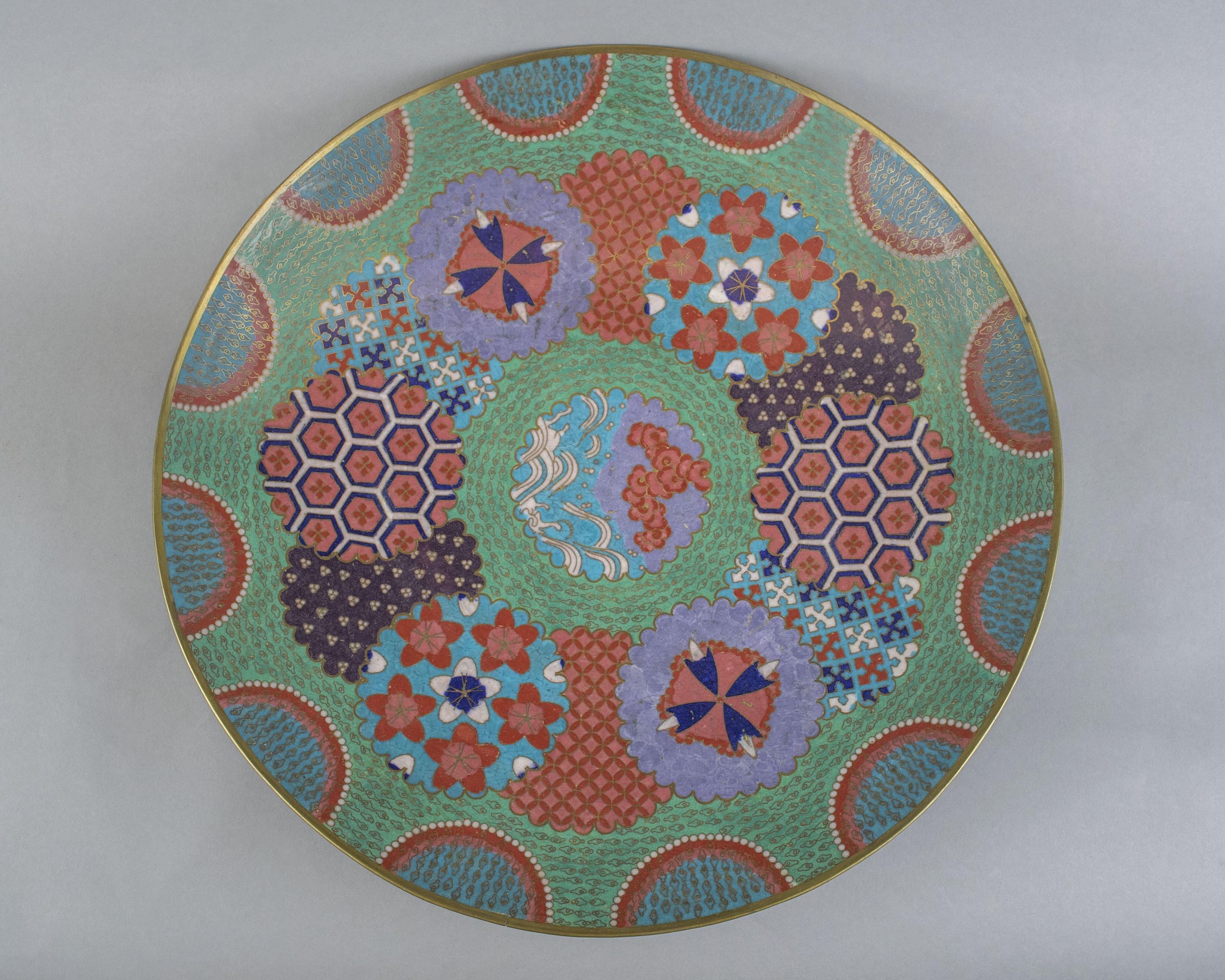 The decorative motif on this cloisonné charger is reminiscent of the popular Imari pattern found on Japanese ceramics.