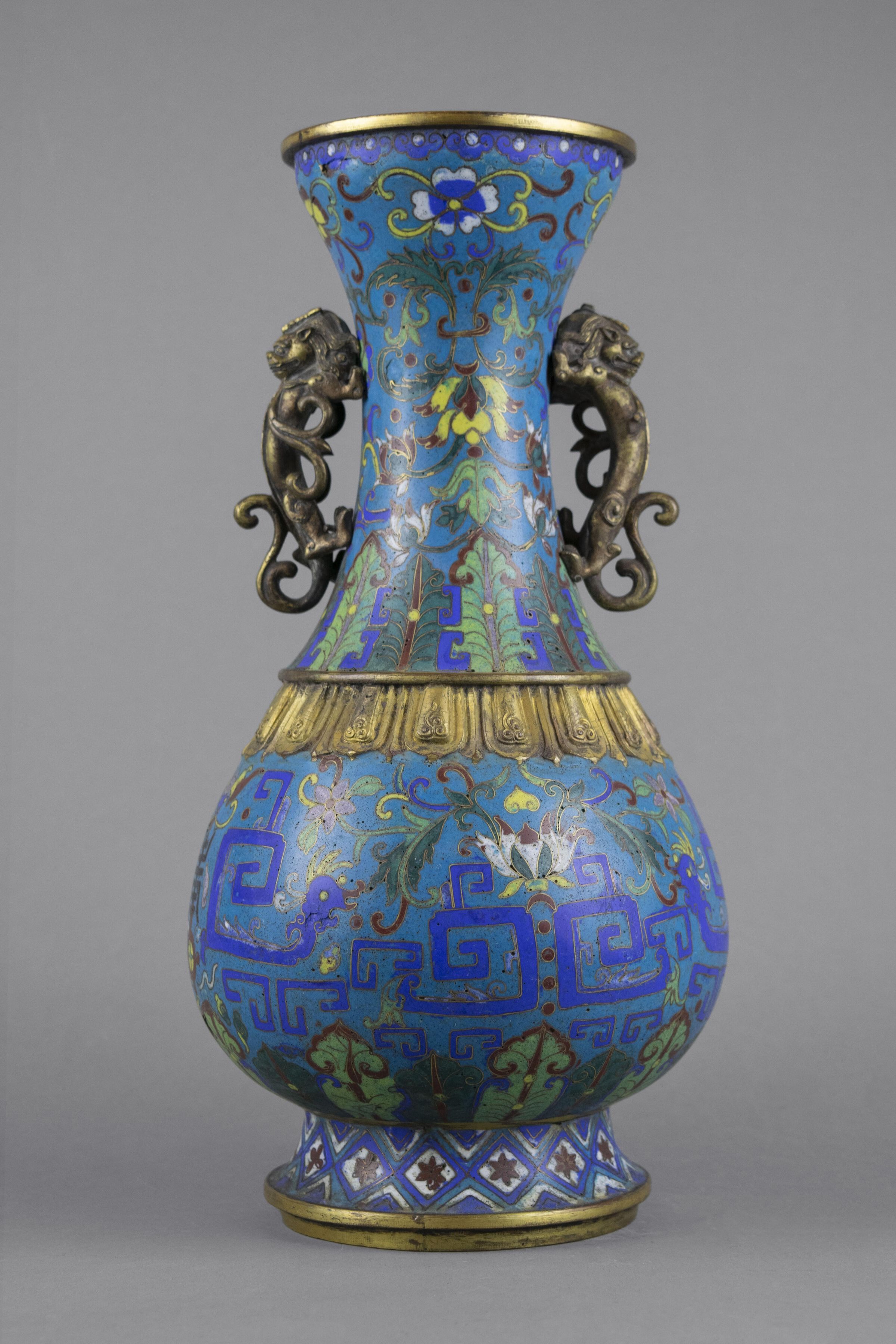 To celebrate the month of February, The Drexel Collection has chosen this cloisonné vase. The development of cloisonné decorated metals in China in the 14th century was largely due to the lively trade with the Islamic world and often reflects strong West Asian influences. Cloisonné is a type of enameling in which opaque powdered glass of various colors is melted onto a metal foundation – usually copper – within outlines of fine wire called “cloisons” (the French word for “cell”). In this case, the copper areas which were not covered by enamel were then gilded. The handles are 2-clawed dragons, indicating that the vase was for commoners; the aristocracy used dragons with 5 claws for their ornaments.