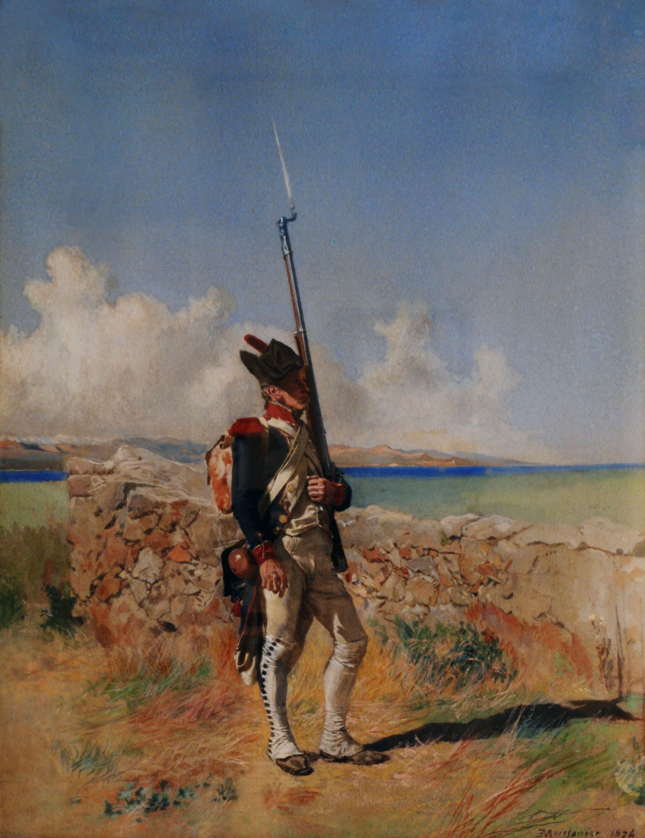 A watercolor by Jean-Louis-Ernest Meissonier, a world-renowned French artist, depicting a Grenadier of the French Revolution’s Army of the Var, standing guard over the River Var in southern France near the Italian border. While the Army of the Var did not see much action, this painting, made in 1874, made the journey into the hands of Anthony J. Drexel within five years, who acquired it by auction in 1879 for $2,100, or over $58,000 in 2024. Gregory Back, Game Design '25