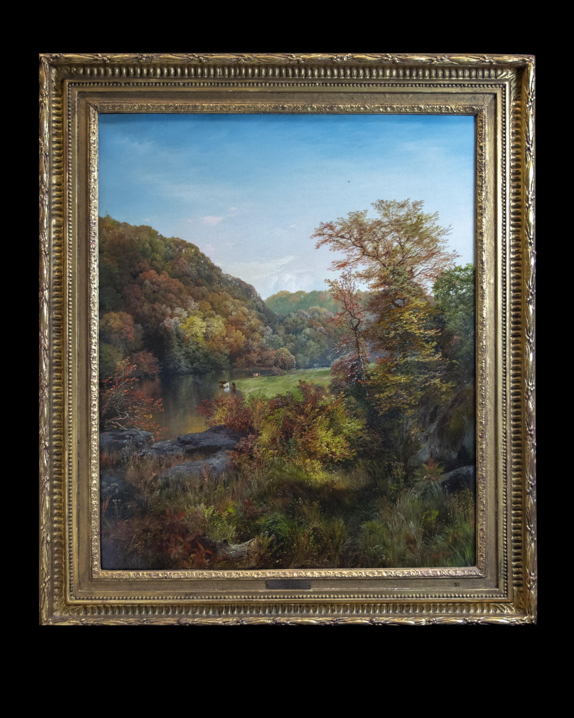 The Wissahickon, a tributary of the Schuylkill River and part of the Fairmount Park system in Philadelphia, PA, was a popular subject for American landscape painters in the 19th century. Thomas Moran (1837-1926), a painter and printmaker, in the Hudson River Valley School painted this view of the Wissahickon in 1863. The Hudson River Valley School was a mid-19th century, American school focused on landscape paintings with influence from romanticism. Although best known for his paintings of western landscapes, Moran’s paintings of the Philadelphia area capture the beauty of the landscape and the changing seasons.Label Type