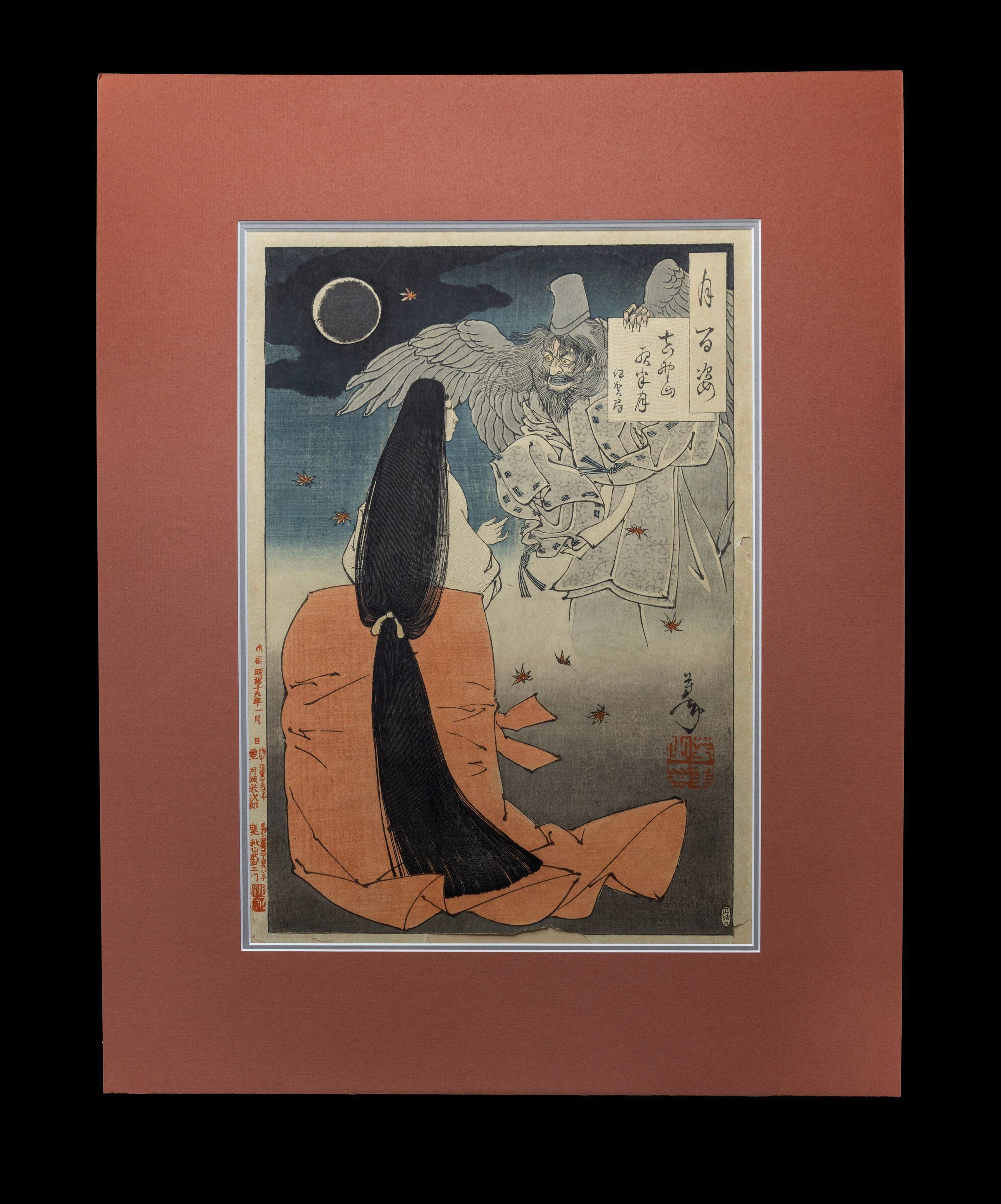 This print tells the story of Sasaki no Kiyotaka, the winged ghost with blue lips commonly used to depict corpses, who was a high official forced to commit ritual suicide for ill-advising Emperor Go-Daigo in the 14th century. Kiyotaka's restless spirit haunted the court and no courtier was willing to face the angry ghost except lady Iga-no-Tsubone.