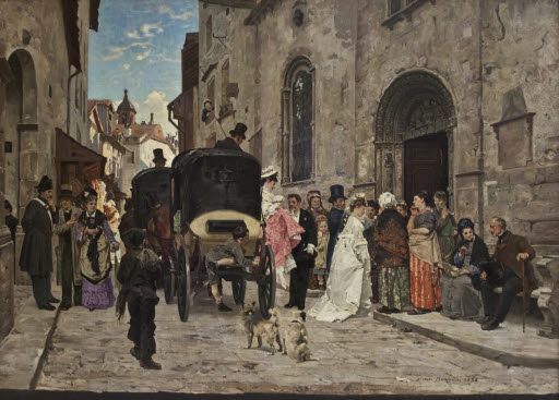 Swiss artist Simon Durand depicts a narrow-cobbled street bordered by tall buildings with the church at the right, the buildings in the middle distance reflecting a warm sunlight with red roofs and a bell tower outlined against a blue sky. Elegantly dressed figures descend from cabs in the foreground and follow the bride passing into the church before a group of spectators. The textures created by the short brushstrokes are common in Durand’s paintings as well as the depiction of a crowd in various styles of dress.