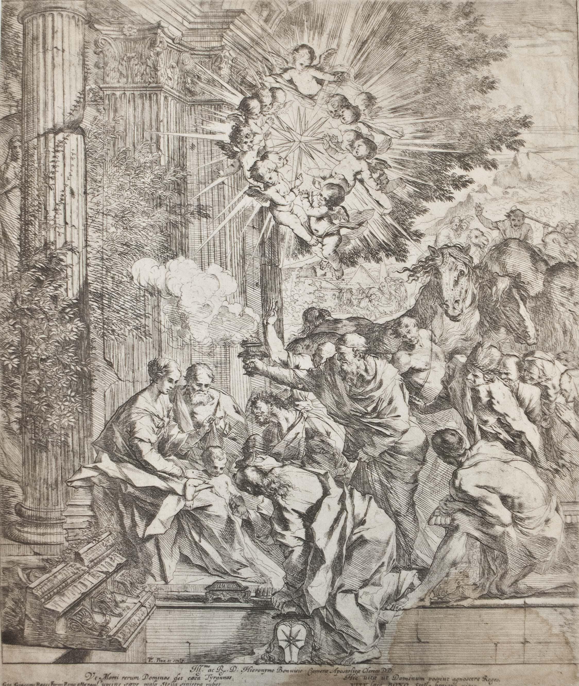 This etching depicts the Adoration of the Magi, which is when the three wise men bring the