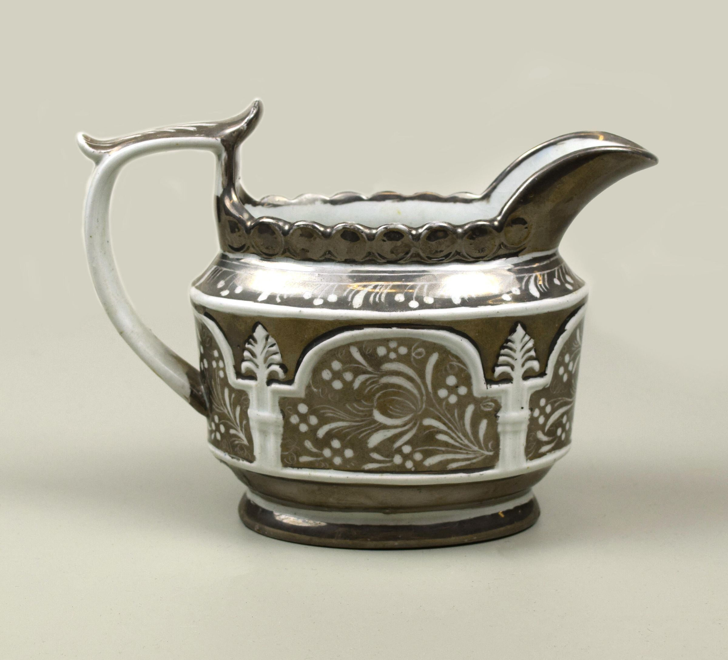 cream jug adds an additional step where the design is painted on the surface in a wax-like substance to prevent the metallic glazes from penetrating the area.