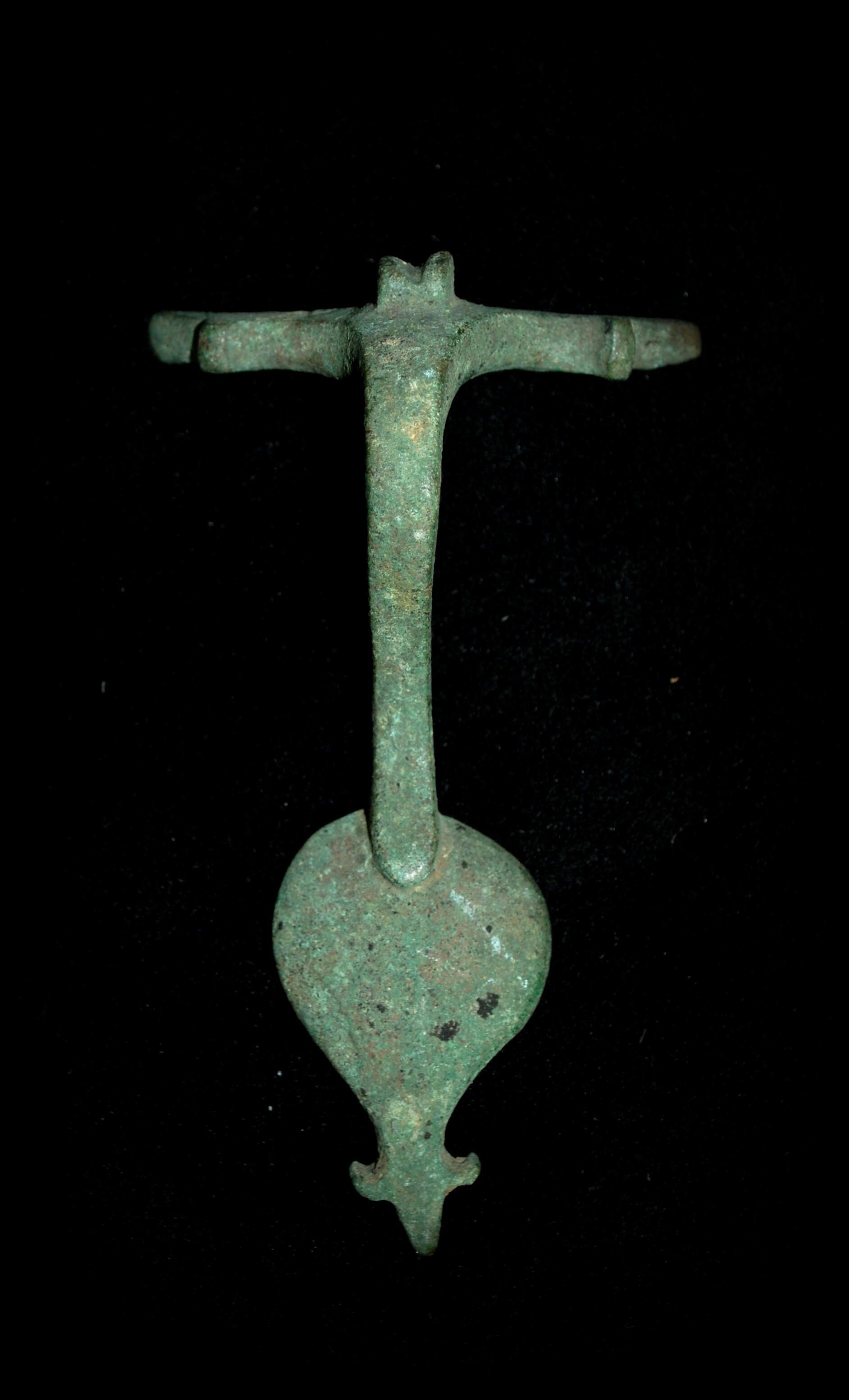 This bronze handle probably once attached to an olpe, a single-handed wine jug adopted by the