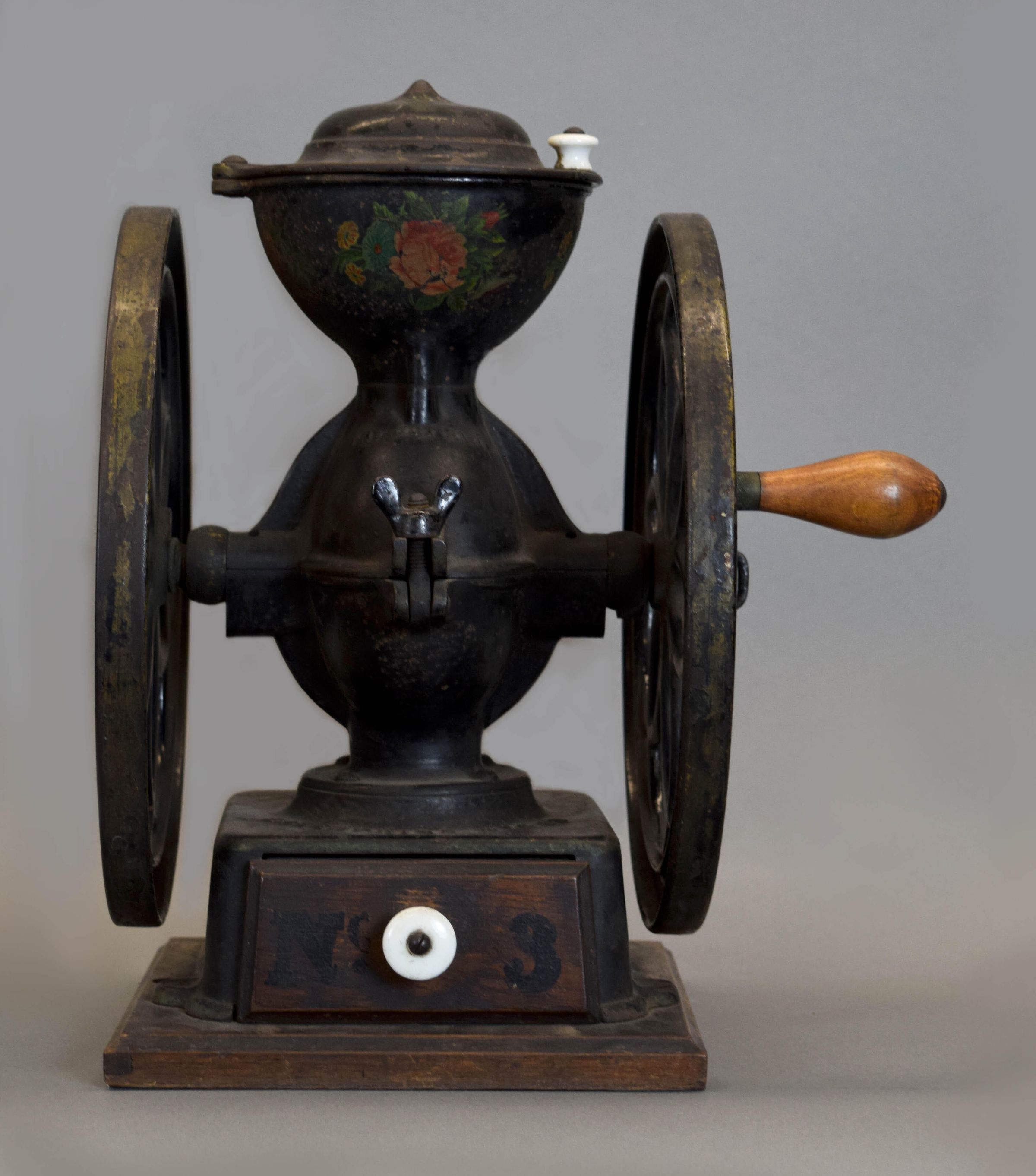 grind. A hopper, grinder and lower drawer are flanked by two large wheels that operate that