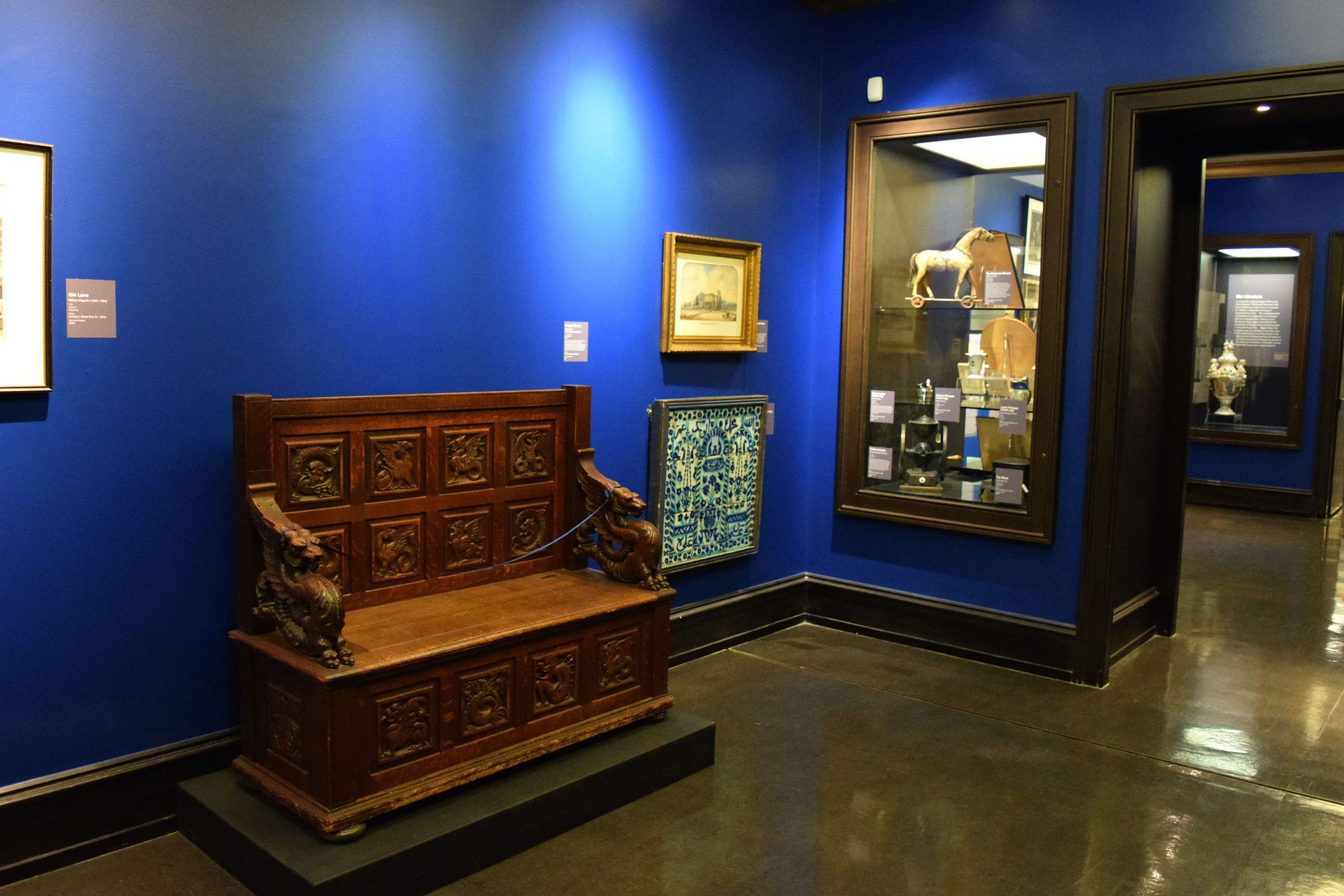This 20th century bench is said to have been designed and made by Drexel University students. Its elaborate carving of dragons, griffins and other mythological beasts evokes a sense of grandeur often related to the Renaissance Revival style where monumental pieces, rich carvings and architectural details were common. Each square reserve on the bench contains a different design displaying the varied characteristics of a dragon’s physical appearance as they change from culture to culture, with some depicted as serpent-like creatures and others with wings and fire, as well as demonstrating the skill of the student artists.Label Type