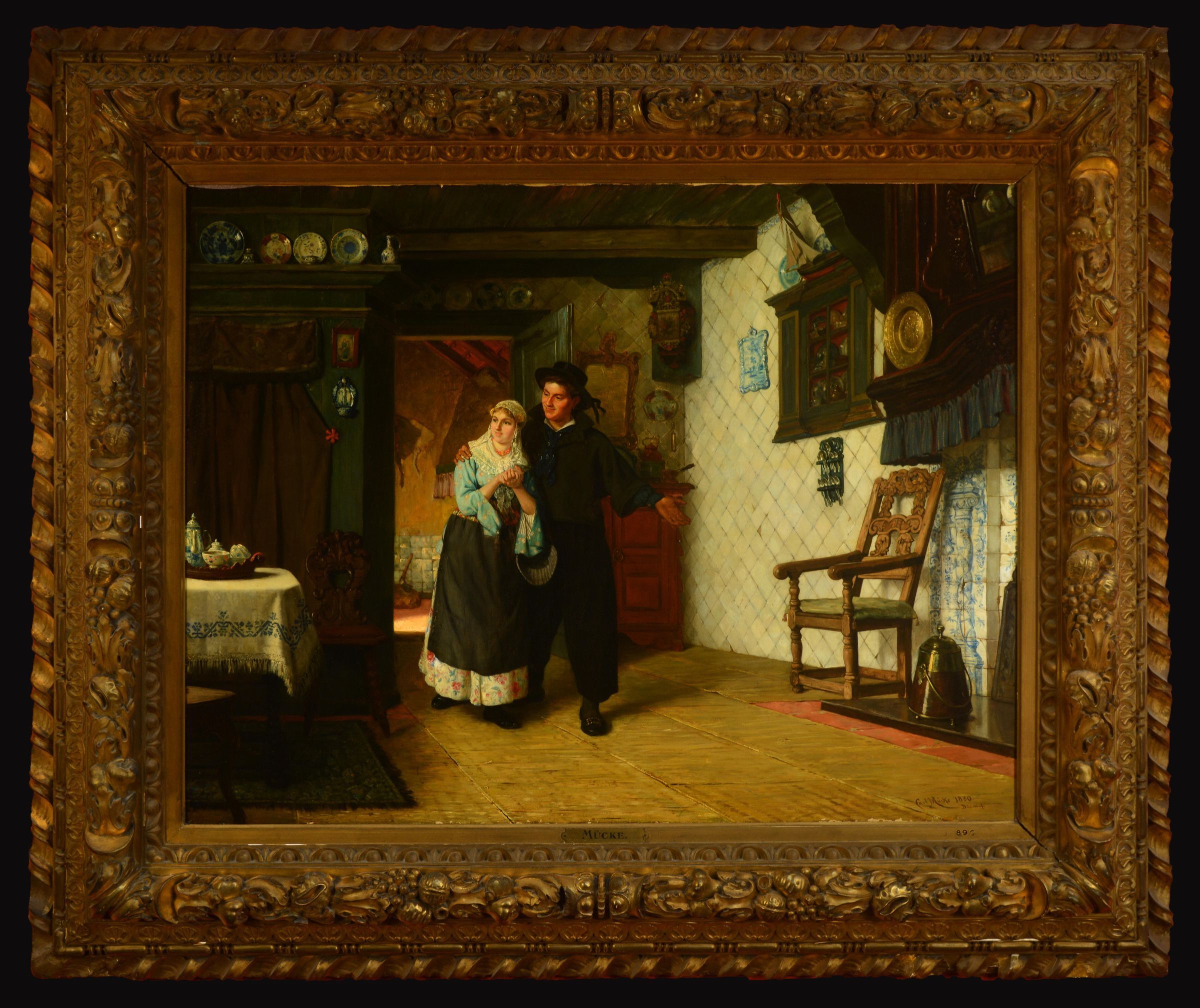 The detailed interior scene of a German home with a low-beamed ceiling and tiled fireplace was common of Mücke, who studied at Düsseldorf Academy and specialized in genre scenes that depict German costumes and interiors of the period.