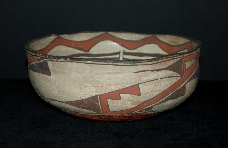 The Native American cultures of southwestern North America shared designs and techniques as can be seen in this Hopi bowl with black, red and white painted decoration, which bares a close resemblance to the Zuni wares.