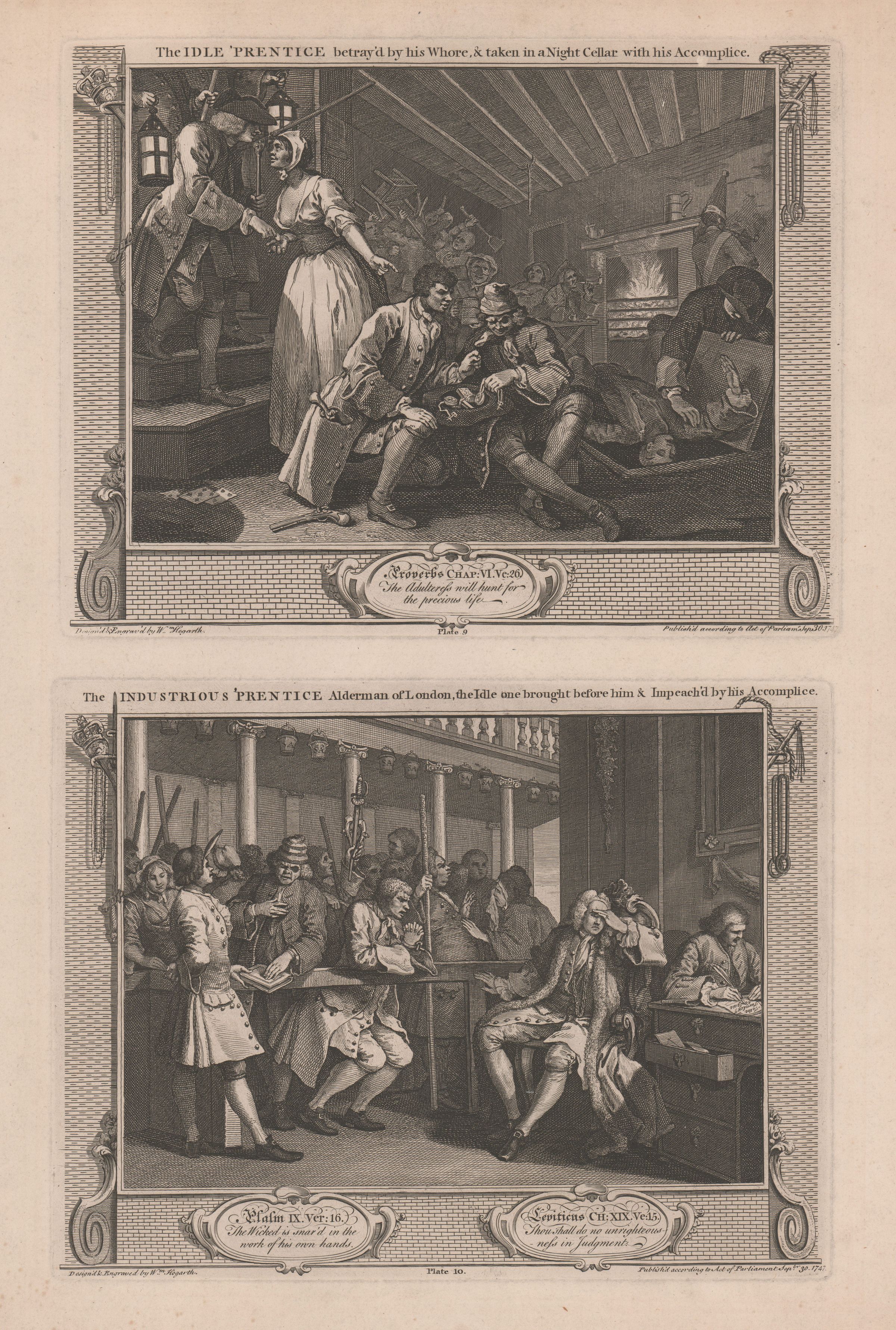 Industry and Idleness: The Idle Prentice Betray'd by his Whore & Taken in a Night cellar with his Accomplice; The industrious Prentice Alderman of London