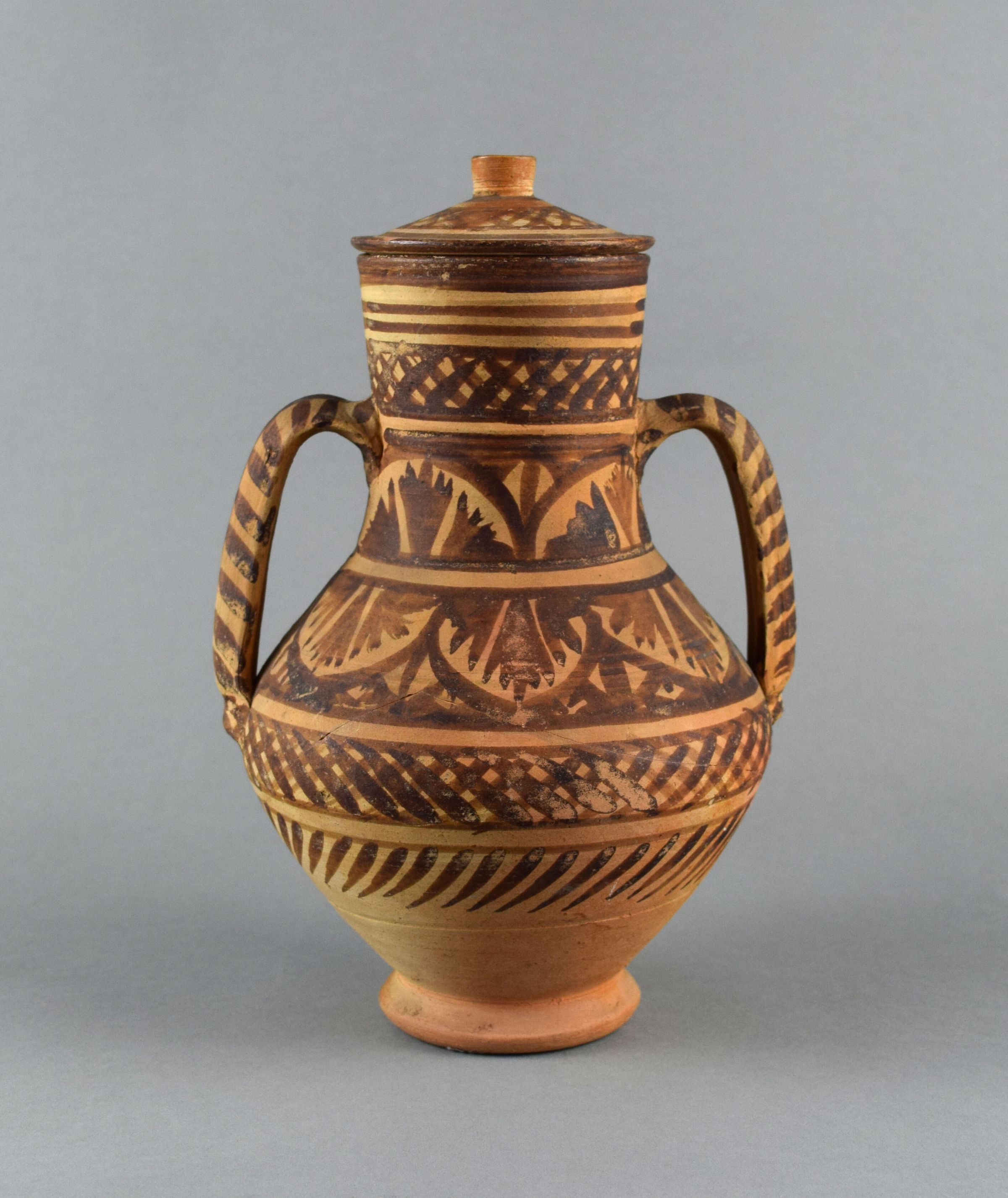 The decoration on these two Spanish earthenware jugs is typical of the repeated foliate and geometric borders found throughout Spanish ceramics, possibly drawn from the Islamic cultures of Spain, which continued to influence ceramic production well after the Christian Reconquista in 1492.