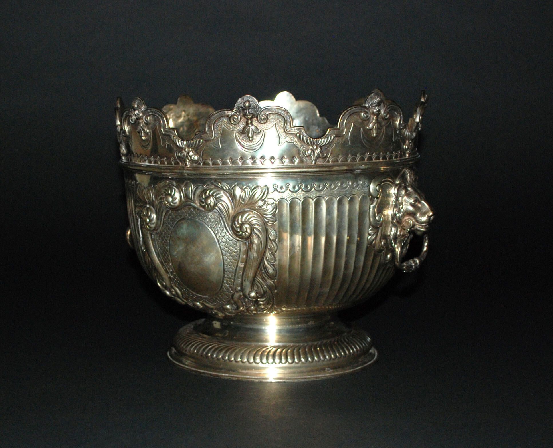 Monteiths were used to cool glasses or rinse them between drinks. Wine glasses were inverted into the bowl with the base of the glass supported by the notches around the rim.Label Type