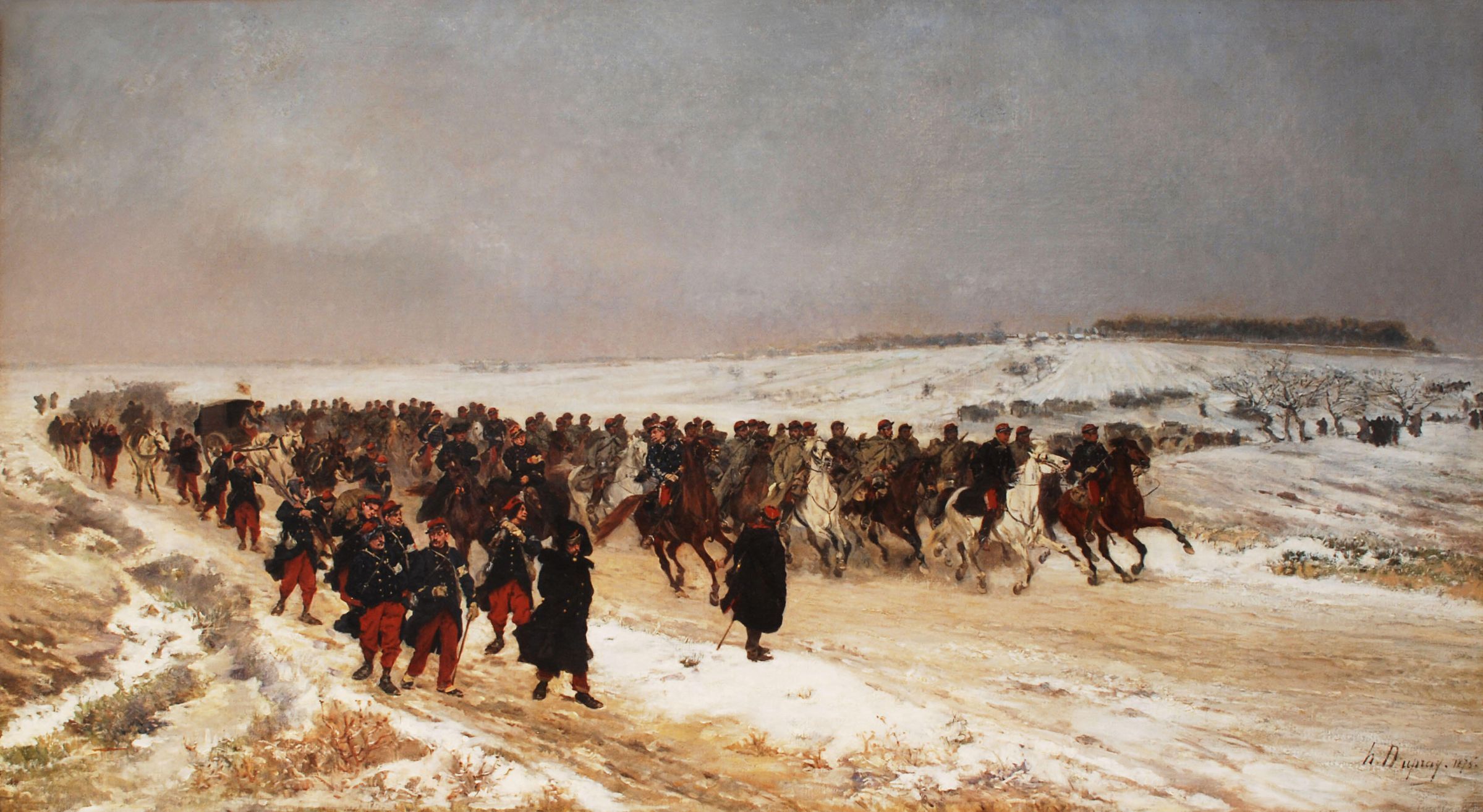 These cold and tired soldiers are wearing the uniforms of French troops in the Franco-Prussian war, which had occurred a few years before this painting was made. Showing a winter campaign, it may represent the Battle of Le Mans where the French were defeated in January 1871. The artist was born in Sedan, France, where one of the definitive battles of the war was fought. The French defeat at Sedan decided the war in favor of Prussia and its allies. That defeat seems to resonate in this painting.
