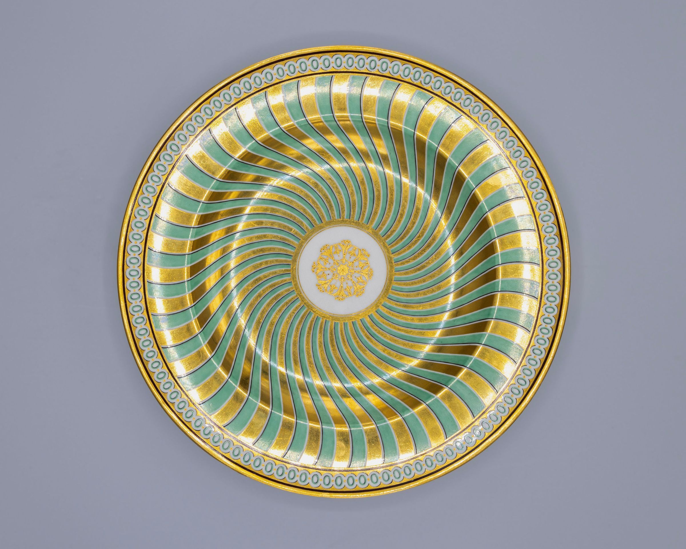 techniques, to create accurately captured scenes, like the cottage scene on this plate, or decorative motifs seen on the spiral decorated plate. Gilded decoration was another area where the Vienna Porcelain Factory excelled; developing a technique with light