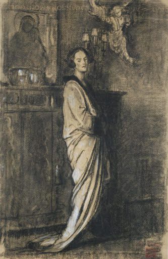 While travelling abroad, Oakley would often draw portraits of the interesting people she met. The dramatic drape of the Baroness’s overcoat and the well-developed surroundings is a testament to Oakley’s training in illustration.