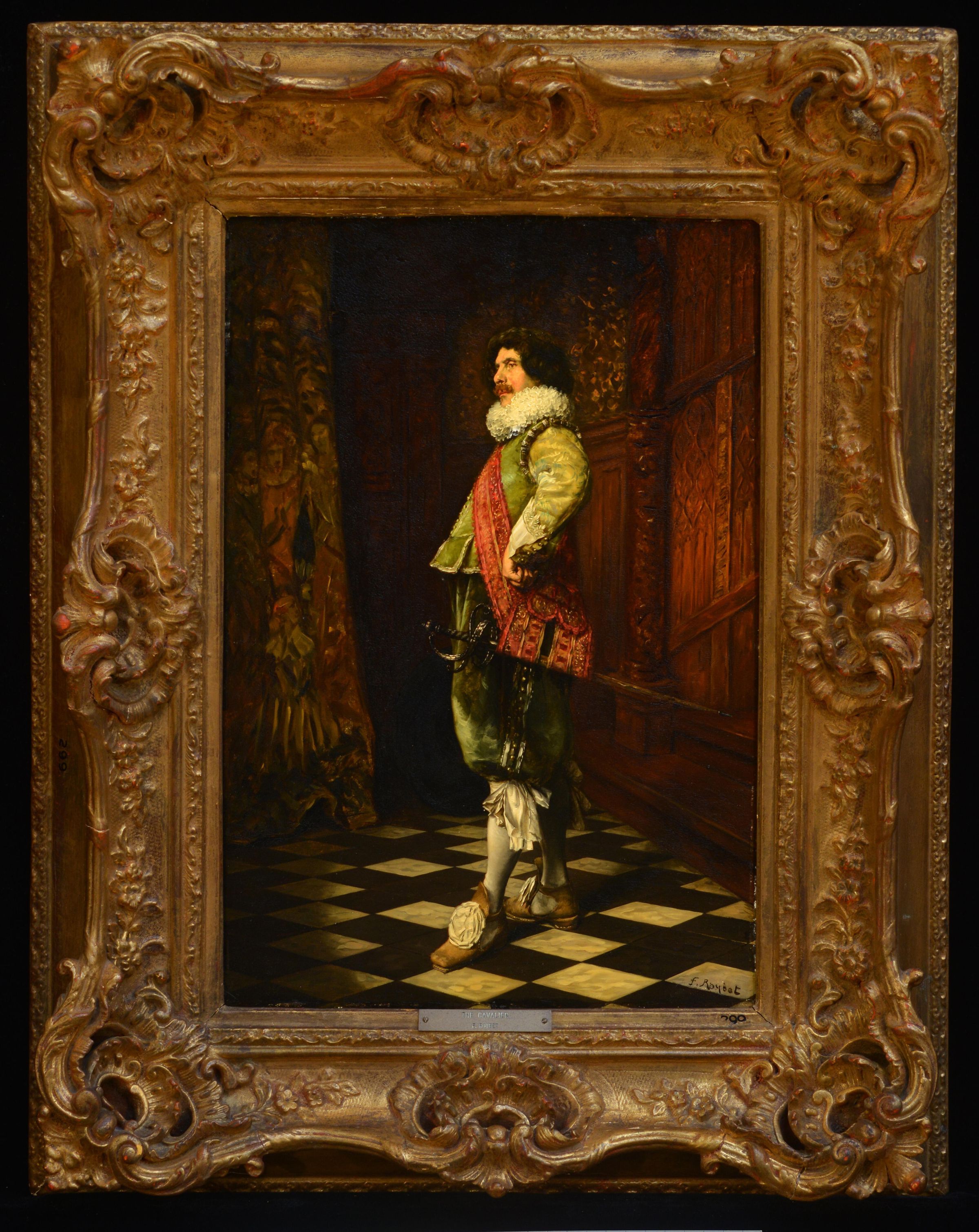 Ferdinand Victoire Leon Roybet was born in the small town of Uzes in France and first studied to be an engraver at Lyons. While on an extensive trip to Holland, he made copies of paintings by Frans Hals and Rembrandt, all of which inspired this painting of a swaggering 17th century-style cavalier in a green velvet suit with red shoulder bag (or sword sling) and sword.