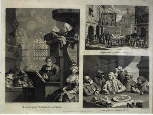 The Sleeping Congregation (1736); Masquerades and Operas, Burlington-Gate (1724); Columbus Breaking the Egg (1752)