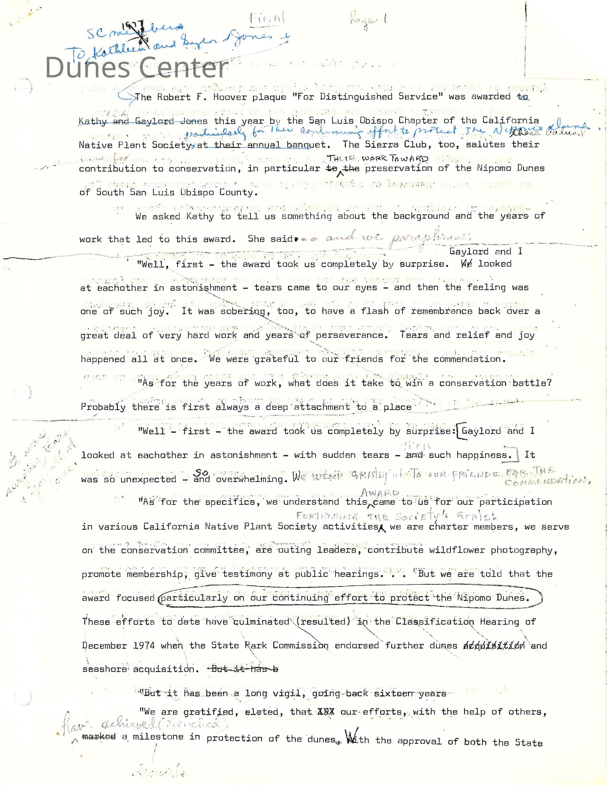 Article regarding the Robert F. Hoover plaque "For Distinguished Service" which was awarded to Kathleen and Gaylord Jones by the San Luis Obispo Chapter of the California Native Plant Society - 1977Entry/Object ID