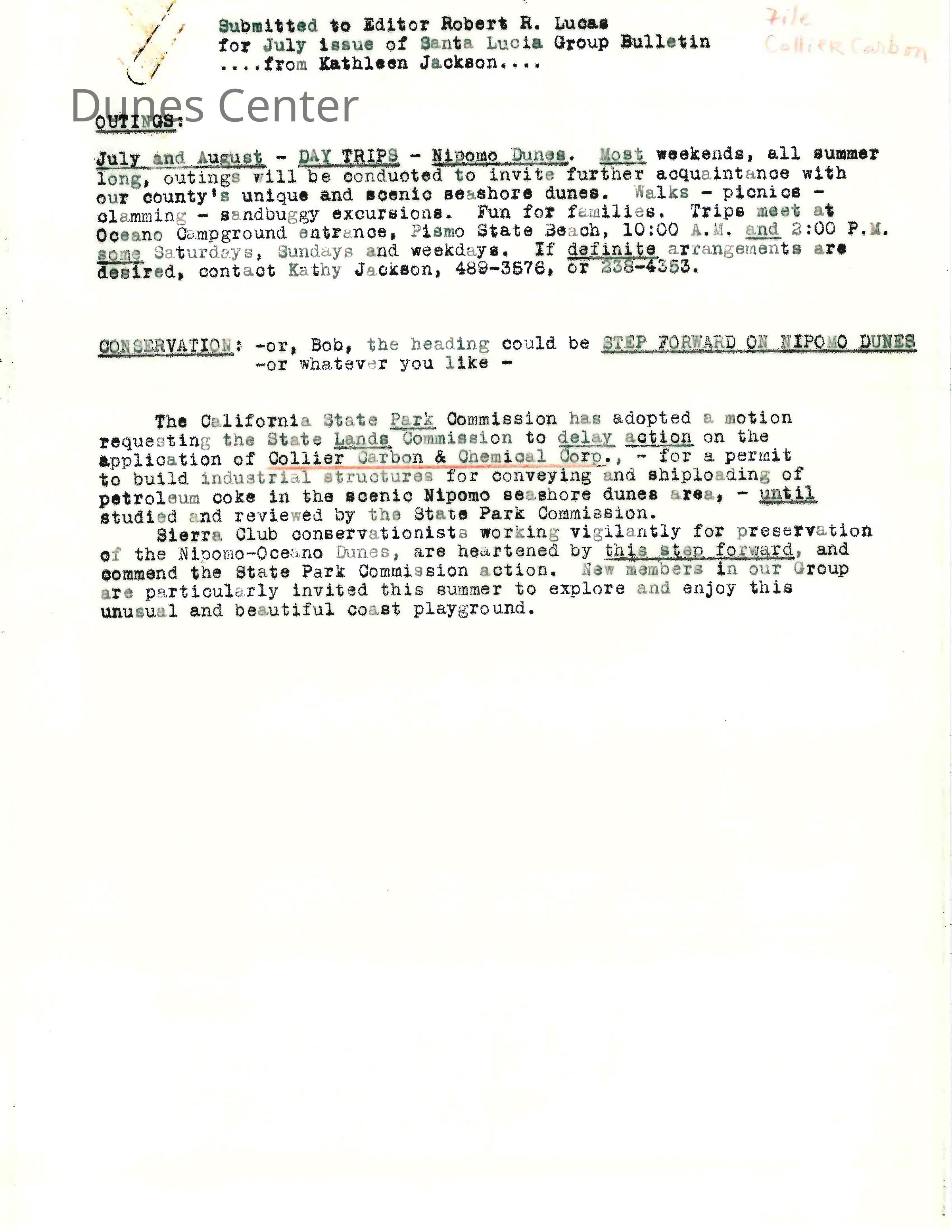 1966. Writing submitted to editor Robert E. Lucas by Kathleen Jackson for the July issue of the Santa Lucia Group Bulletin regarding future outings and news about the State Lands Comission delaying the permit application from the Collier Carbon and Chemical Corportation to build a coke plant on the Nipomo Dunes until studied and reviewed by the State Park Commission.Collection