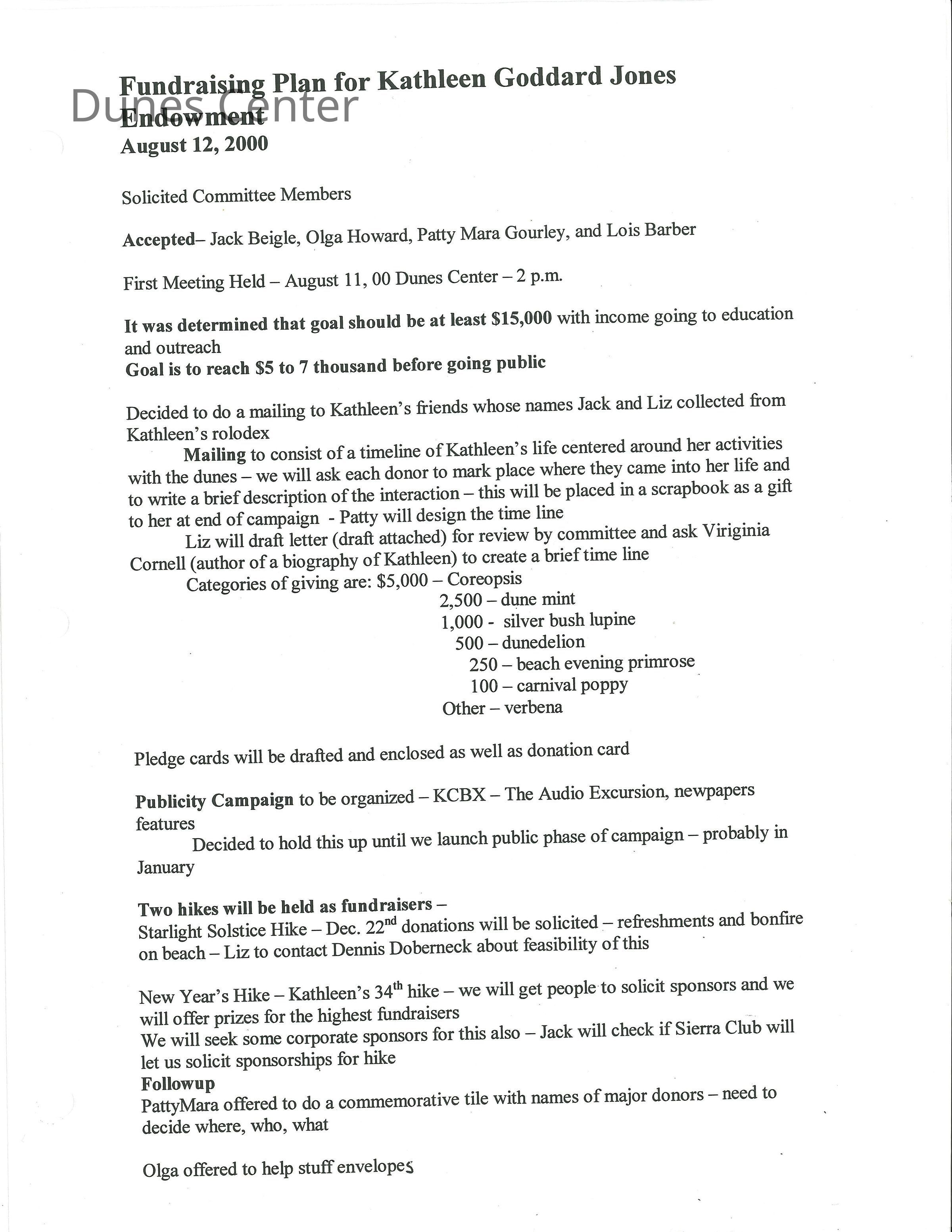 Fundraising plan for Kathleen Goddard Jones Endowment - August 12 - 2000