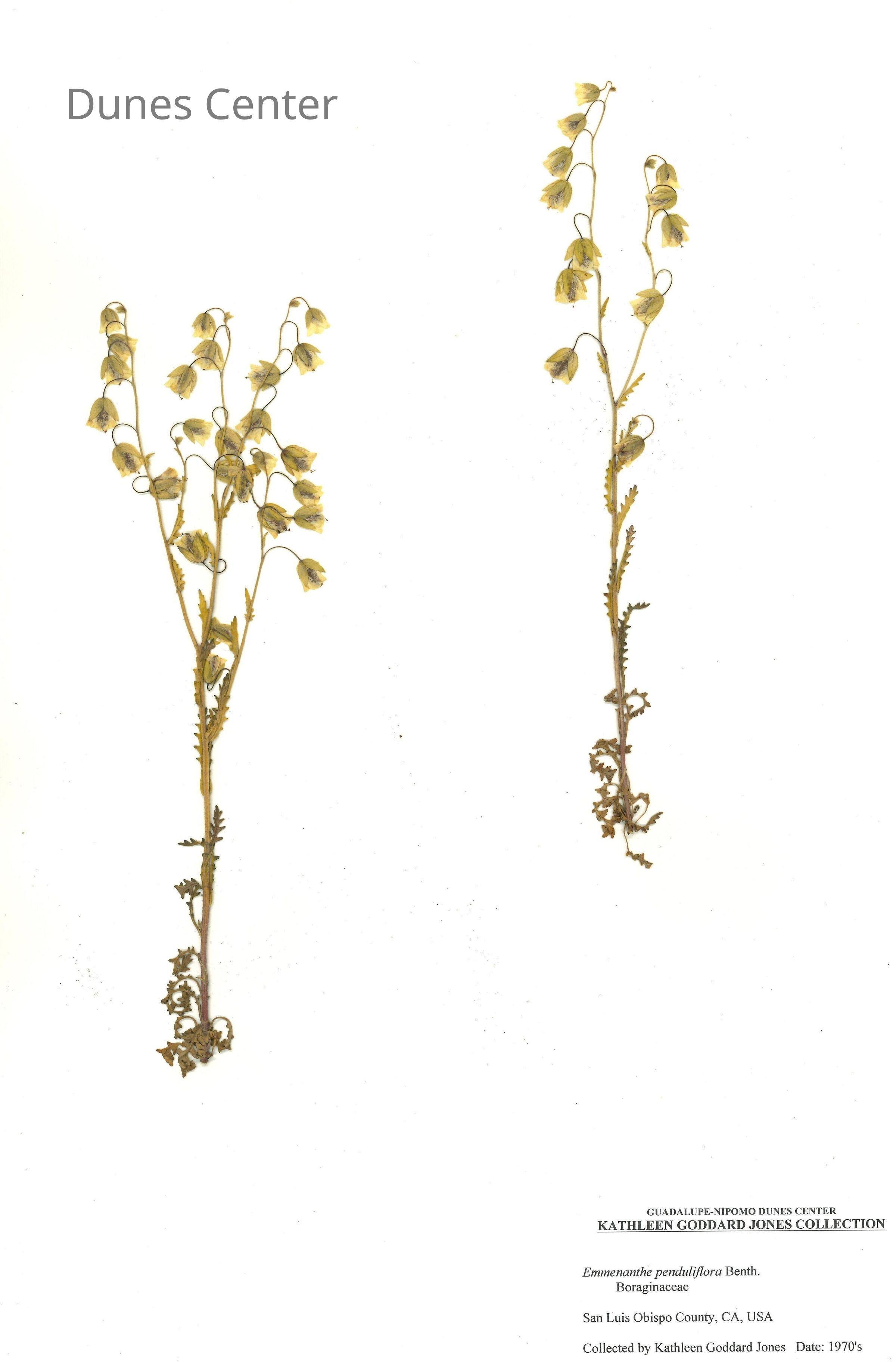 Common Name: Whispering Bells Scientific Name: Emmenanthe penduliflora Benth. Family: Boraginaceae San Luis Obispo County, CA, USA Collected by Kathleen Goddard Jones Date: 1970'sCollection