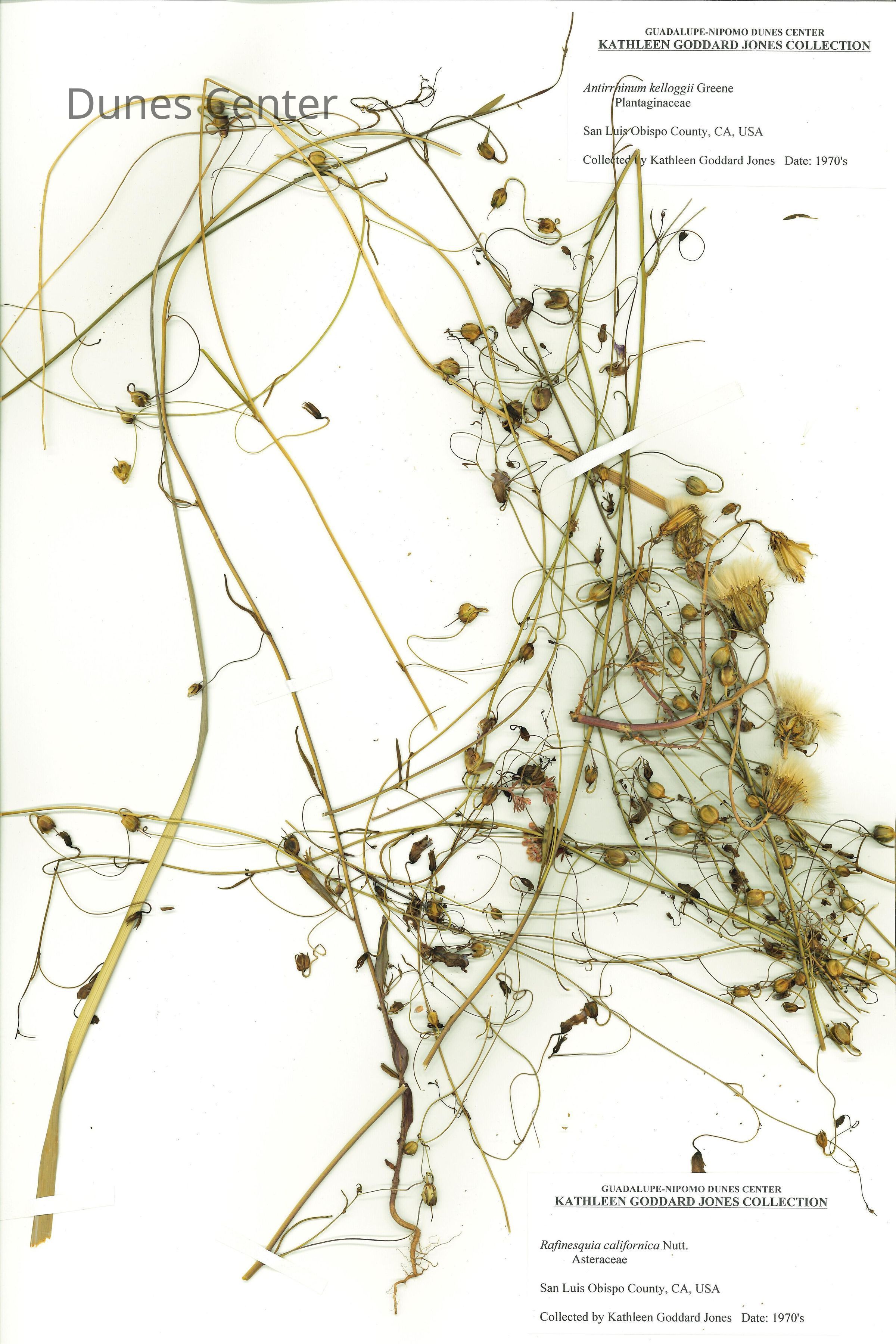 Specimen 1: Common Name: California Chicory, California Plumseed Scientific Name: Rafinesquia california Nutt. Family: Asteraceae San Luis Obispo County, CA, USA Collected by Kathleen Goddard Jones Date: 1970's Specimen 2: Common Names: Climbing Snapdragon, Kellogg's Snapdragon Scientific Name: Antirrhinum kelloggii Greene Family: Plantaginaceae San Luis Obispo County, CA, USA Collected by Kathleen Goddard Jones Date: 1970'sCollection
