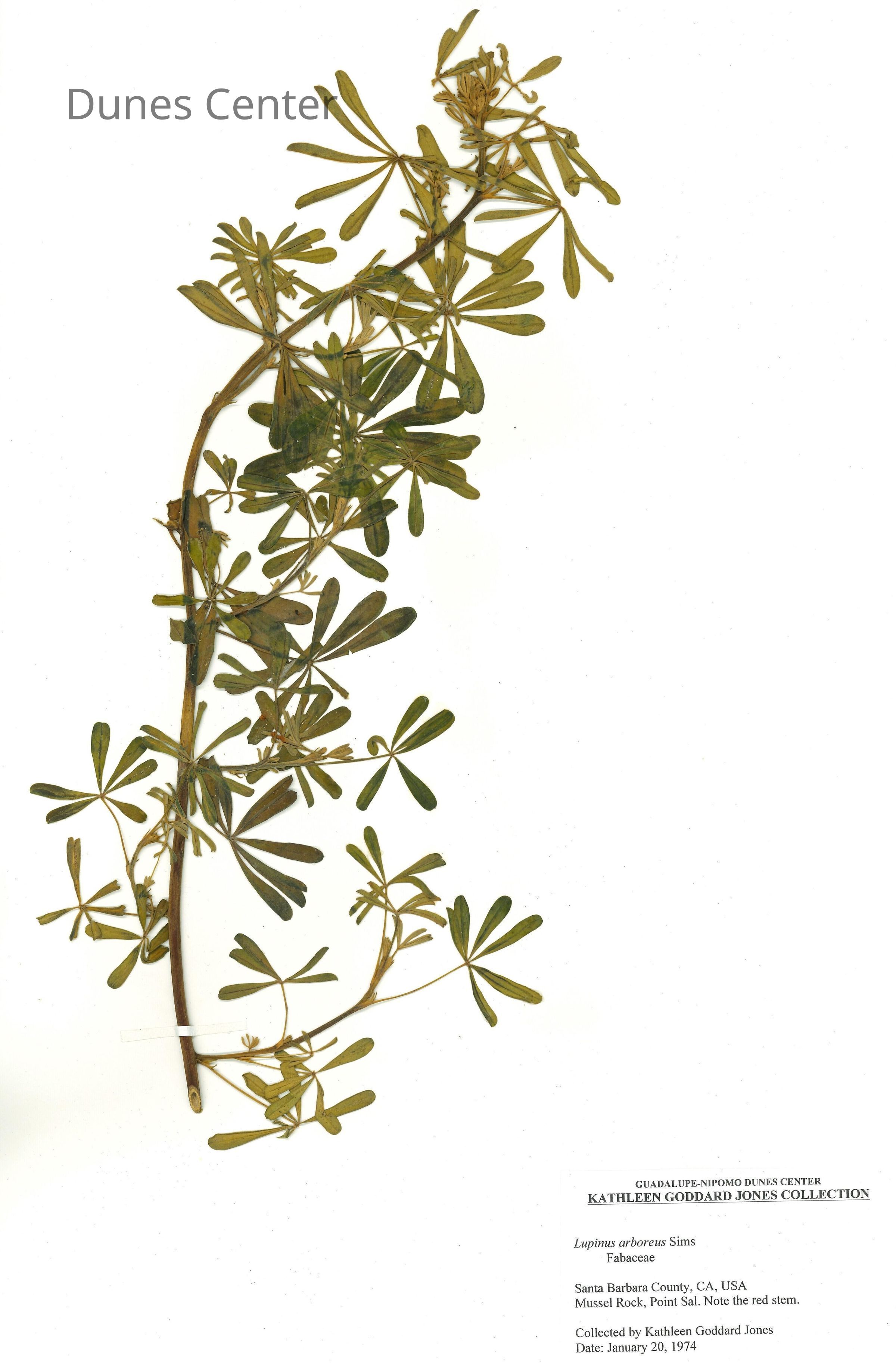 Common Names: Coastal Bush Lupine, Yellow Bush Lupine Scientific Name: Lupinus arboreus Sims Family: Fabaceae Santa Barbara County, CA, USA Collected by Kathleen Goddard Jones Date: January 20, 1974Collection