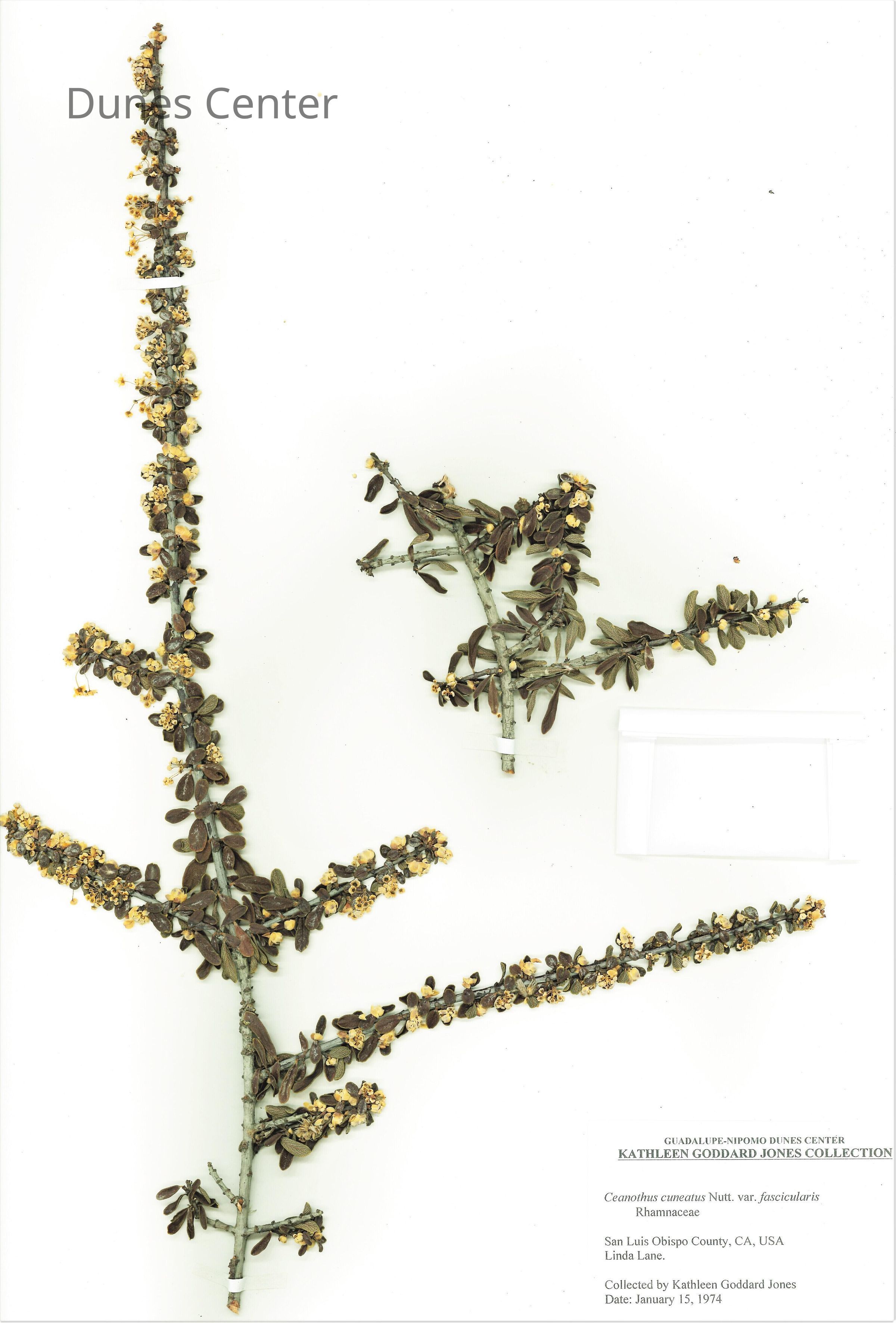 Common Names: Sand Buck Brush, Sedgeleaf Buckbrush Scientific Name: Ceanothus cuneatus (Hook.) Nutt. var. fascicularis (McMinn) Hoover Family: Rhamnaceae San Luis Obispo County, CA, USA Linda Lane. Collected by Kathleen Goddard Jones Date: January 15, 1974Collection