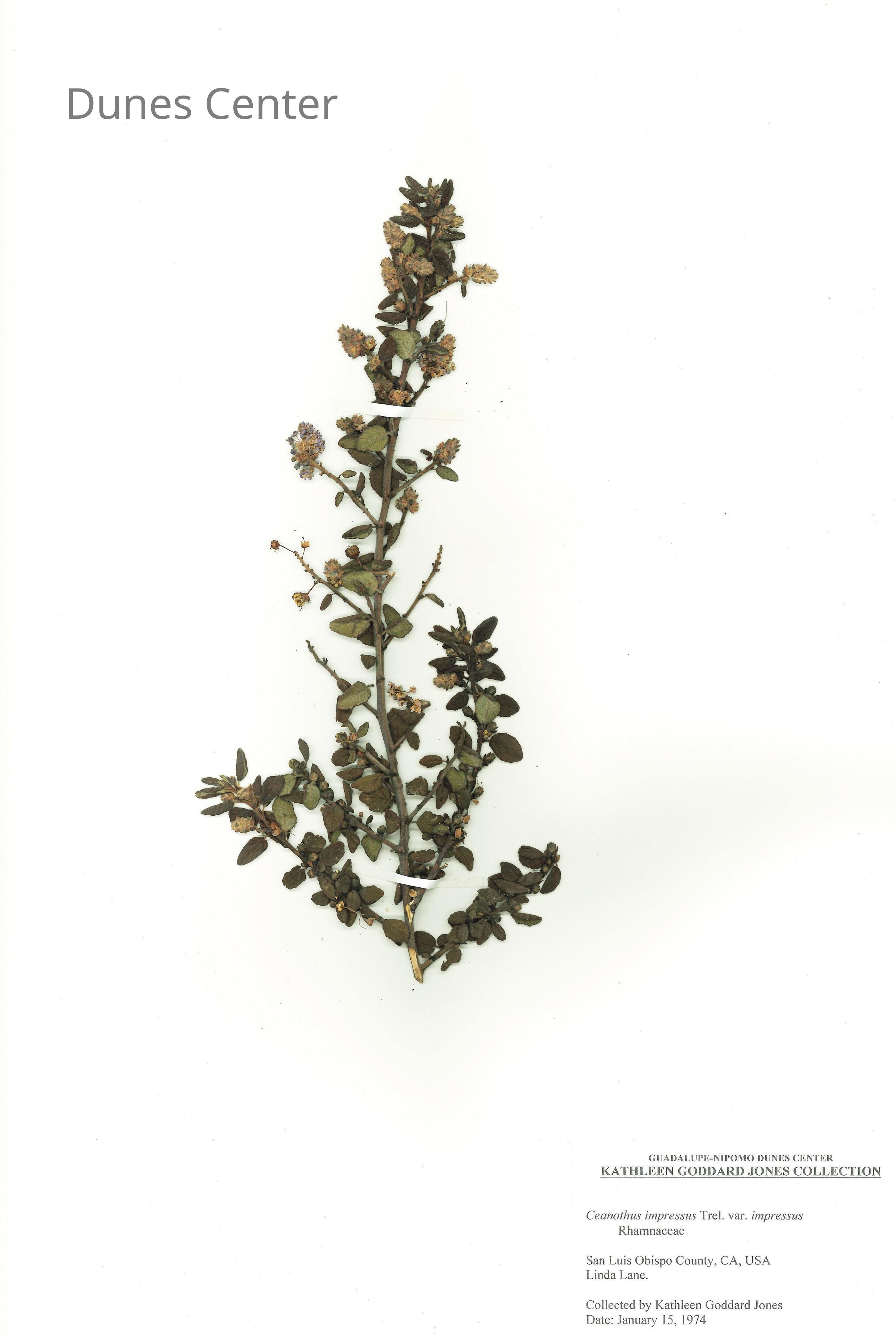 Common Name: Santa Barbara Ceanothus Scientific Name: Ceanothus impressus Trel. var. impressus Family: Rhamnaceae San Luis Obispo County, CA, USA Linda Lane. Collected by Kathleen Goddard Jones Date: January 15, 1974Collection