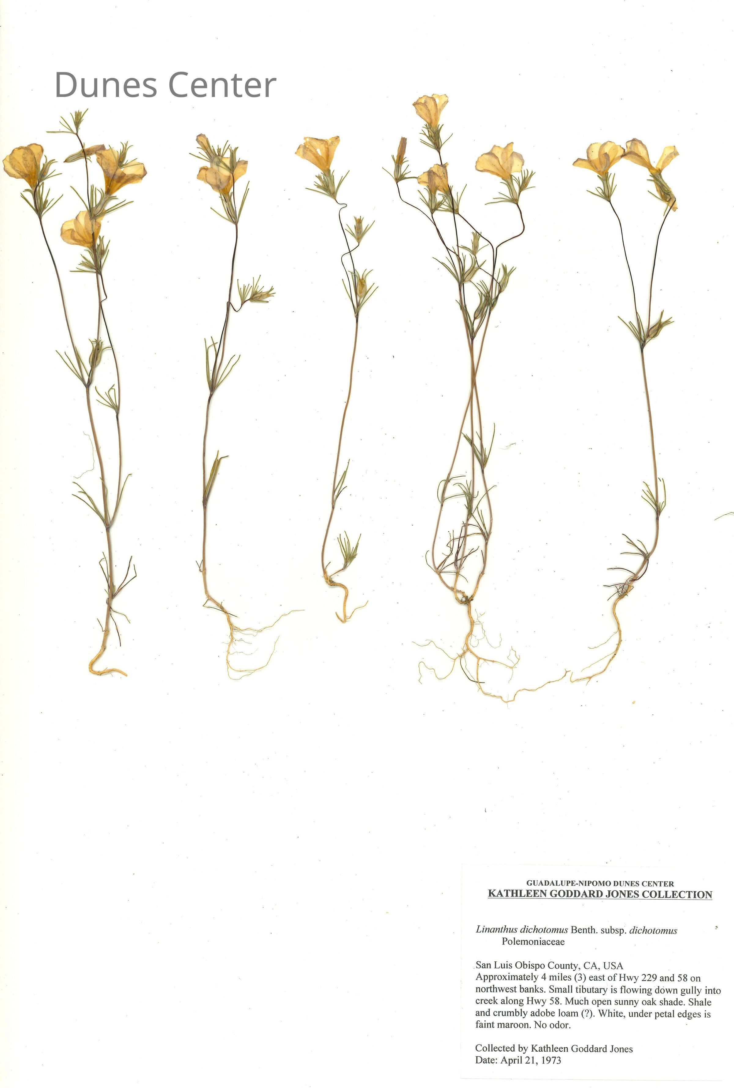 Common Name: Evening Snow Scientific Name: Linanthus dichotomus Benth. subsp. dichotomus Family: Polemoniaceae San Luis Obispo County, CA, USA Approximately 4 miles (3) east of Hwy 229 and 58 on northwest banks. Small tributary is flowing down gully into creek along Hwy 58. Much open sunny oak shade. Shale and crumbly adobe loam (?). White, under petal edges is faint maroon. No odor. Collected by Kathleen Goddard Jones Date: April 21, 1973Collection