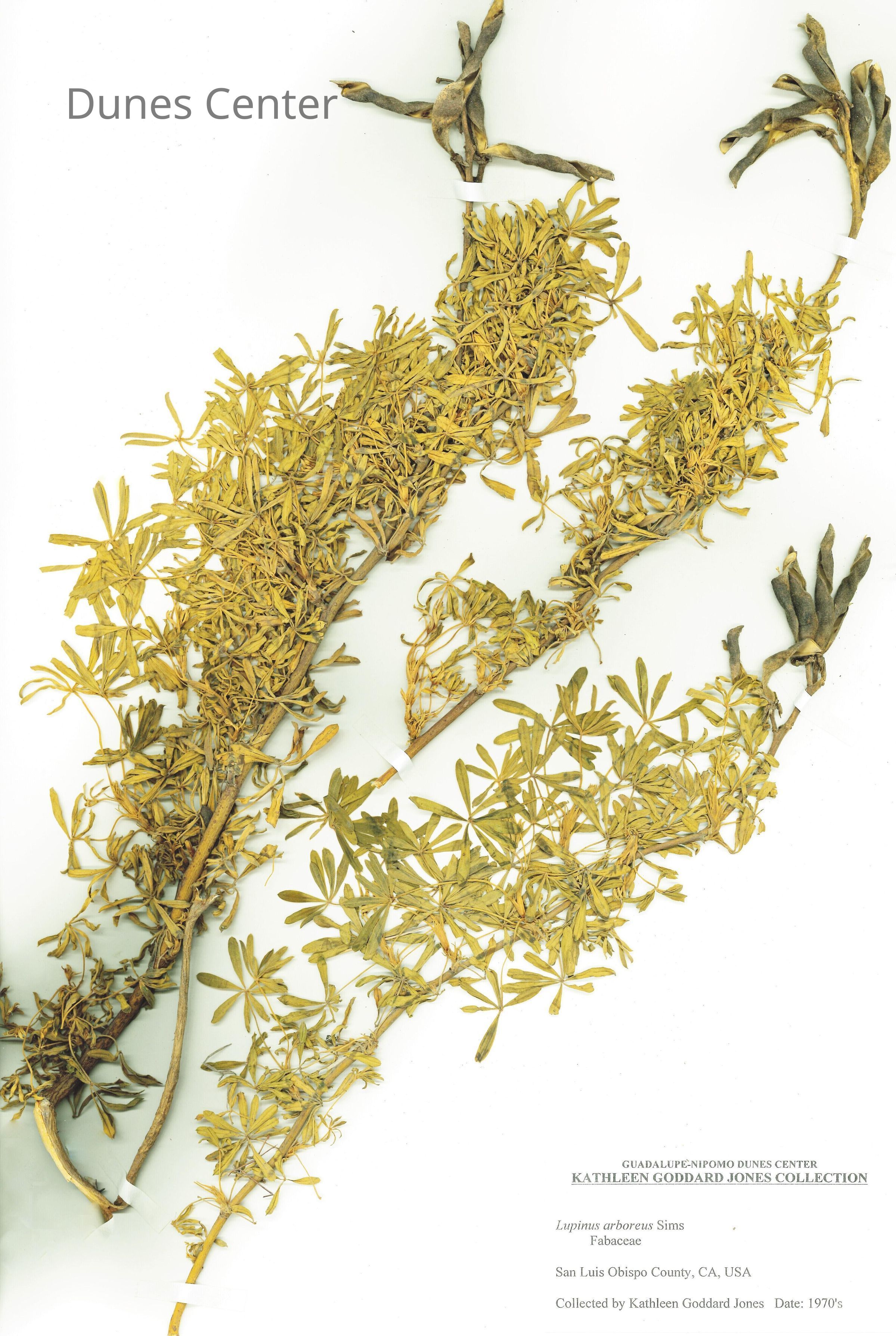 Common Names: Coastal Bush Lupine, Yellow Bush Lupine Scientific Name: Lupinus arboreus Sims Family: Fabaceae San Luis Obispo County, CA, USA Collected by Kathleen Goddard Jones Date: 1970'sEntry/Object ID